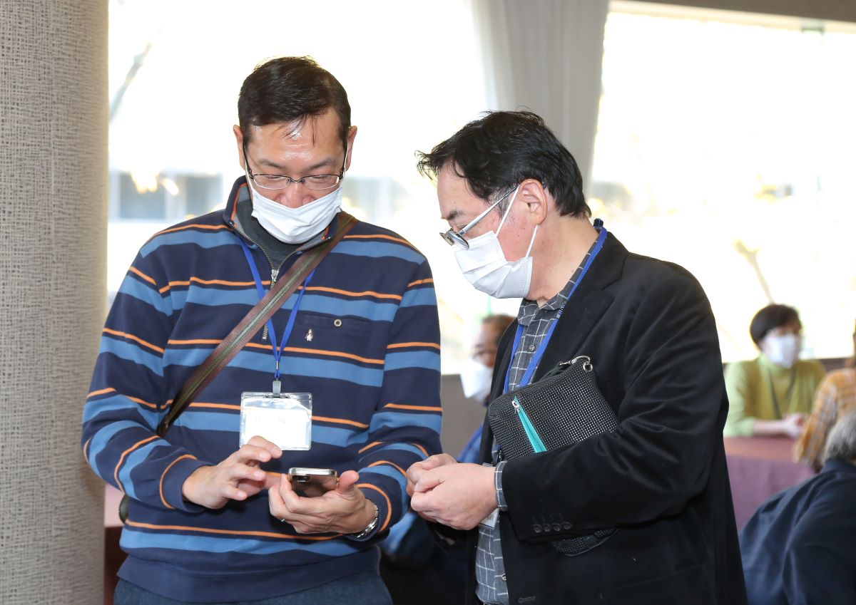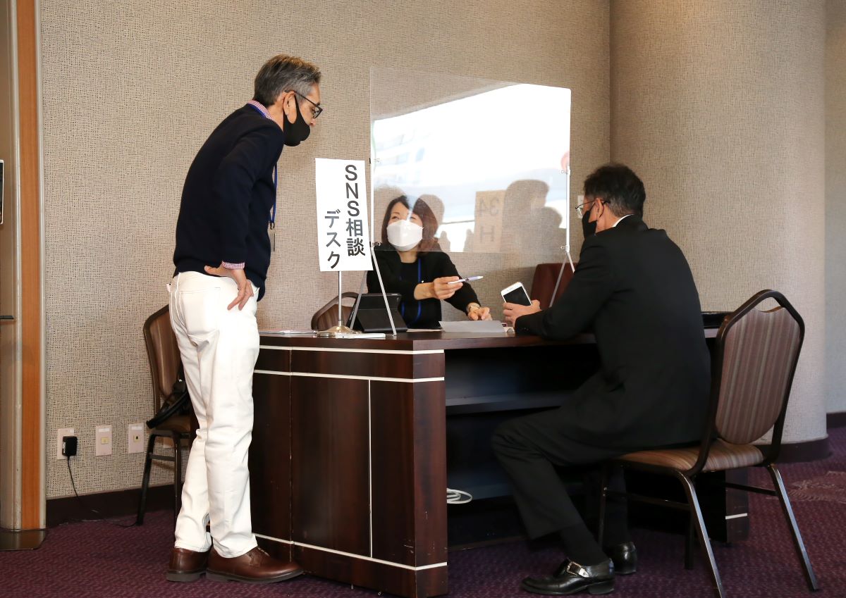 とはいえ、中には不慣れな方もたくさんいるので練習も必要です。受付前の「SNS相談デスク」に最初にやってきたのは、そんなクラス幹事さんたちでした笑。写真はともかく「LINEアルバム」は利用経験がなくて、ちょっと手間取ったようです。