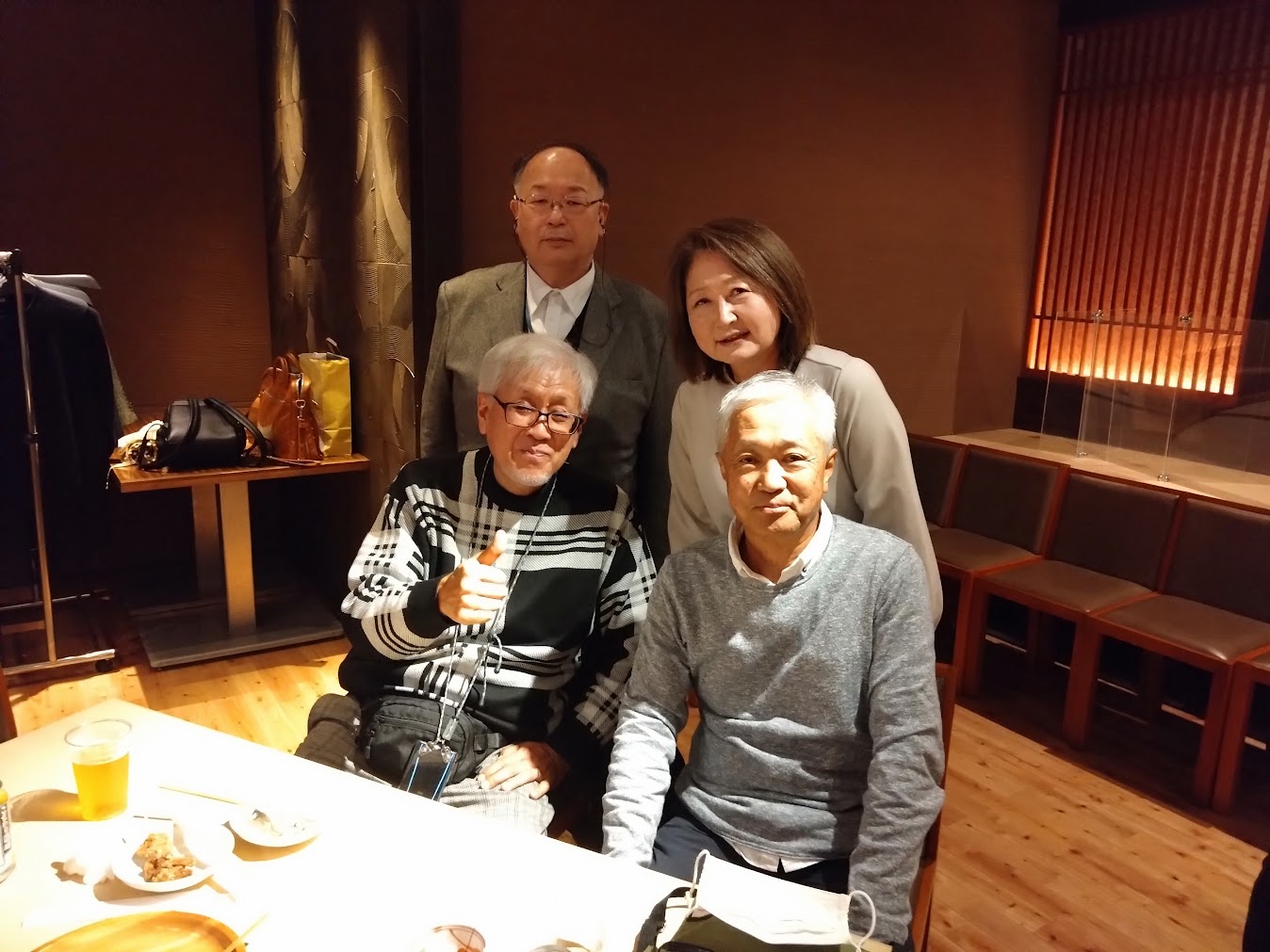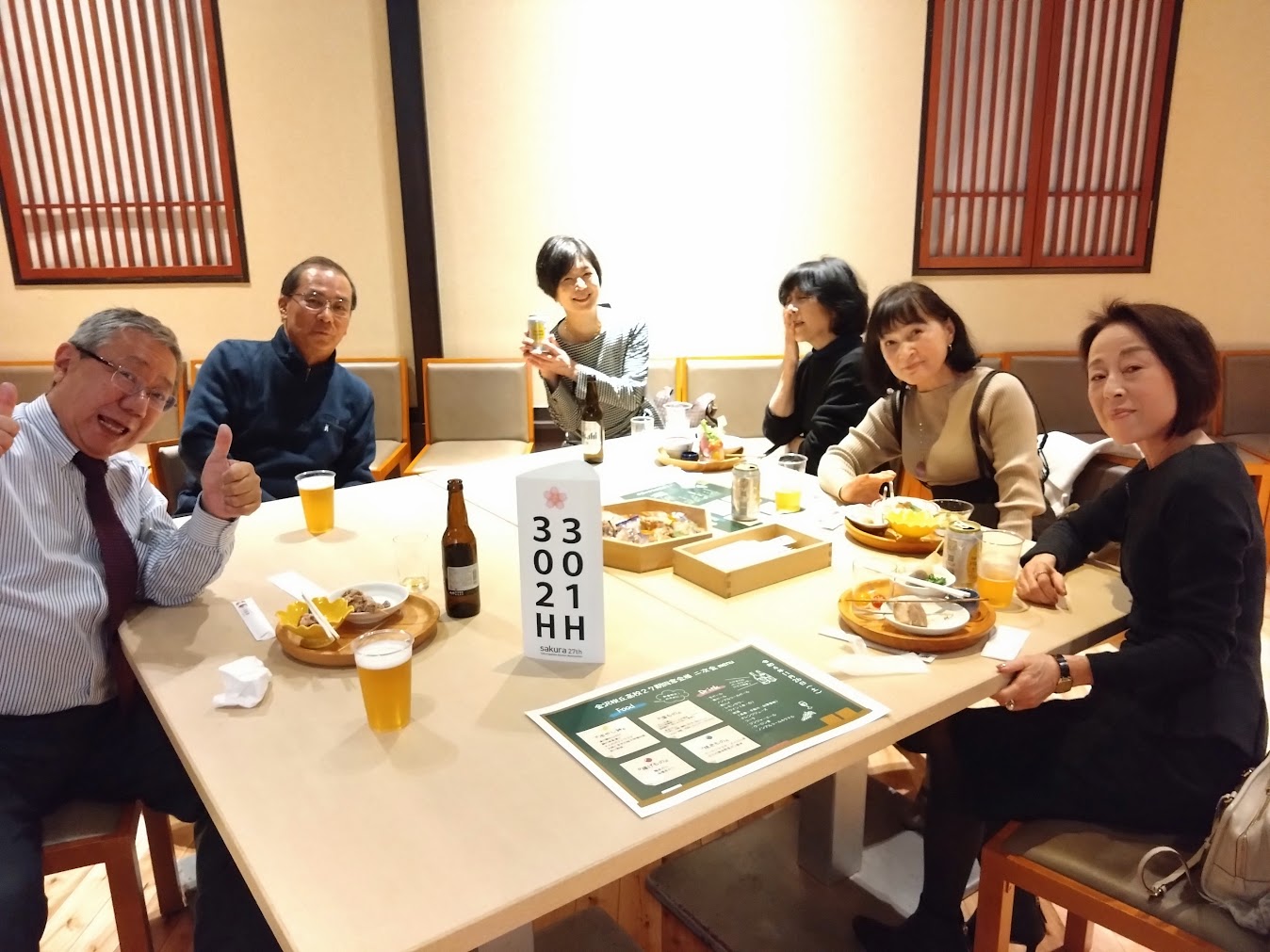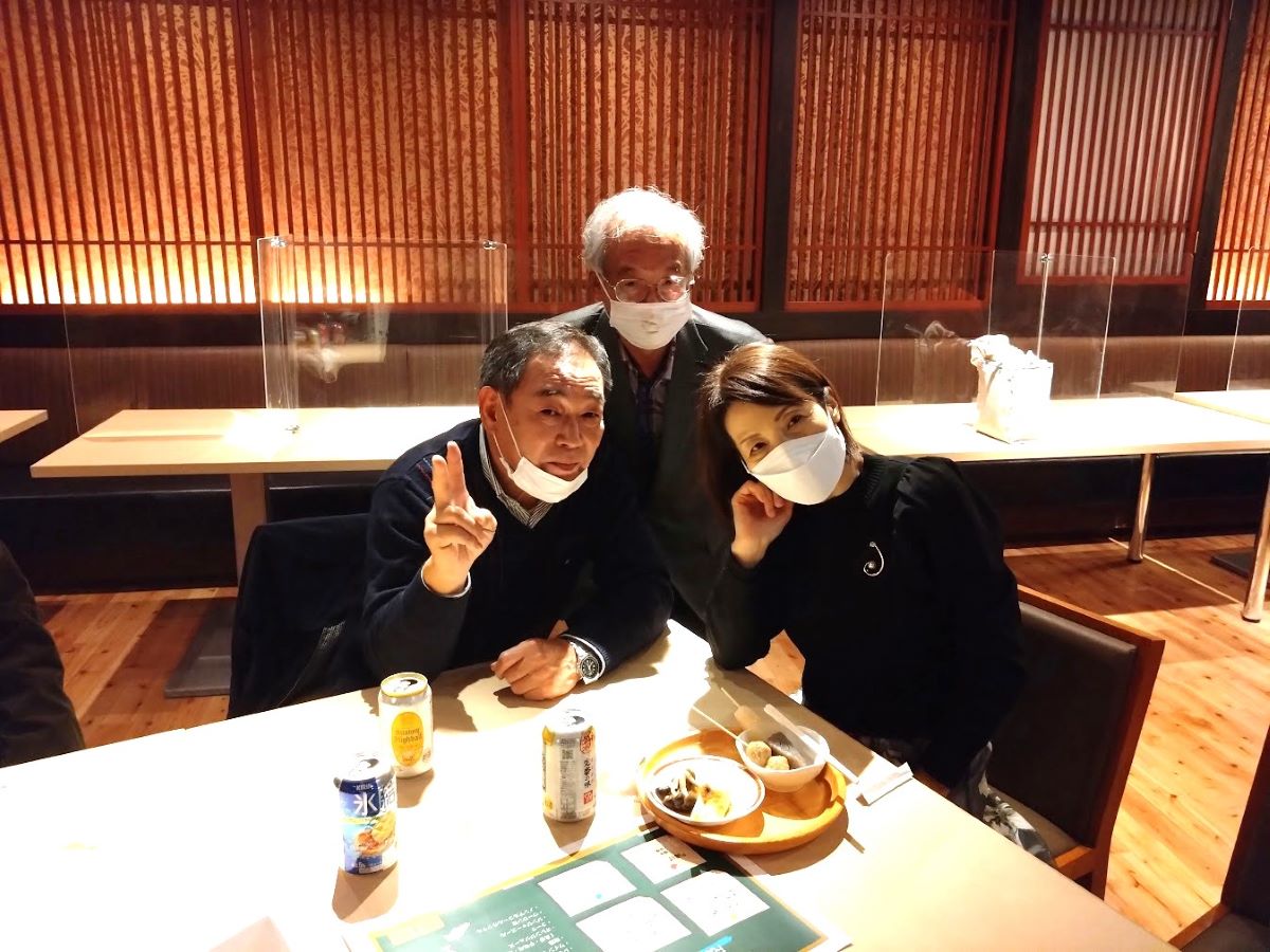 みきやんの玄関先には「本日貸し切り中」の貼り紙がありました笑。どうやら最後に合流したのが僕たちのようです。2階にはすでに同級生がたくさん座っているらしく、1階でも数人がテーブルを囲んでいて、笑顔で迎えてくれました。時刻はまだ20時頃ですが、3次会です。数えてないのですが、おおよそ20人くらいの同級生が集まっているようです。まぁ、ほぼ満席状態なので、僕たち編集部の2人は玄関近くのカウンターに座って本日の初ビールで乾杯です。相棒K中くんは、もう動画を撮ることもなく、僕もスマホ撮影は終了です笑。