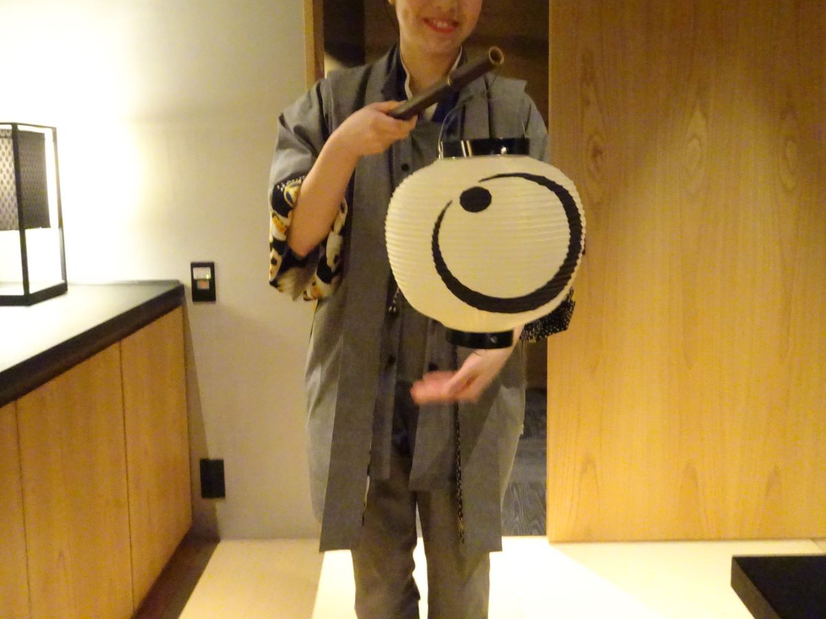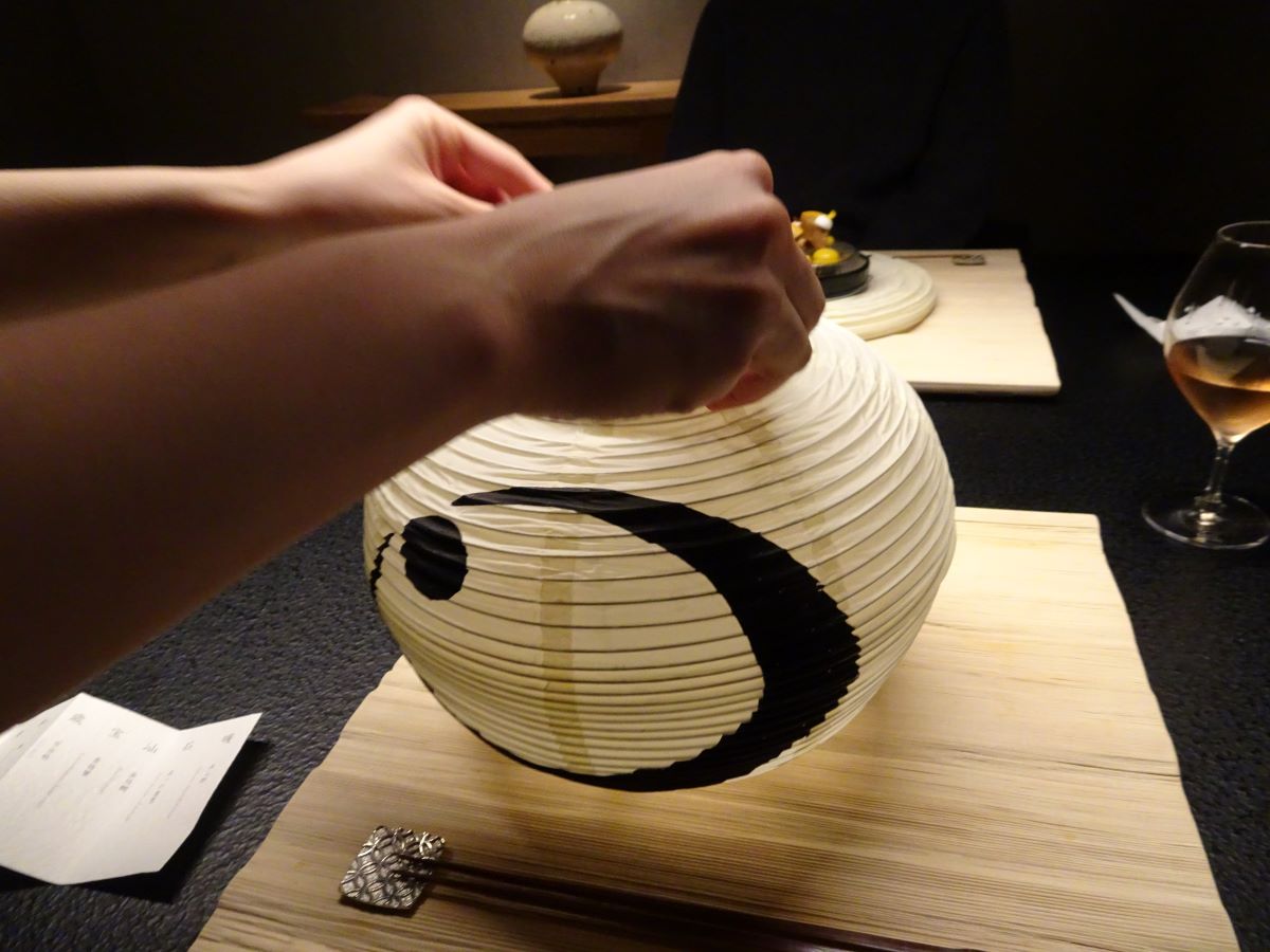 生ビールとアミューズを終えて、彼の本来の1品目が始まる。お品書きでは「あんこう」だ。個室の扉から静かに入ってきたスタッフが持っているのは、棒にぶら下がっている「ちょうちん」だった??笑。