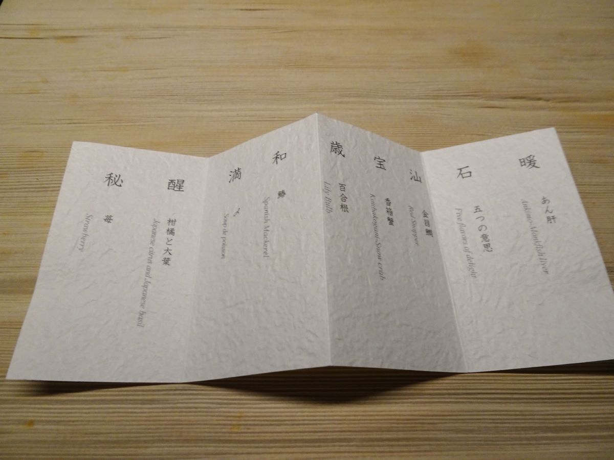 コース仕立ての「お品書き」は料理人からの「お手紙」だと思う。並ぶ商品の順番には意味があって、起承転結はもちろん、狙う驚きや笑顔や楽しみを随所に埋め込んだ、料理という「2時間ほどの旅」のガイドブックということもできる。彼の料理のお品書きには、漢字一文字のテーマと、使う食材である「魚介」などの名前が順に並ぶ、そんな独特のスタイルだ。日本を表現するために彼が選び、日本固有の海と大地の恵みに立ち向かっているように感じる。