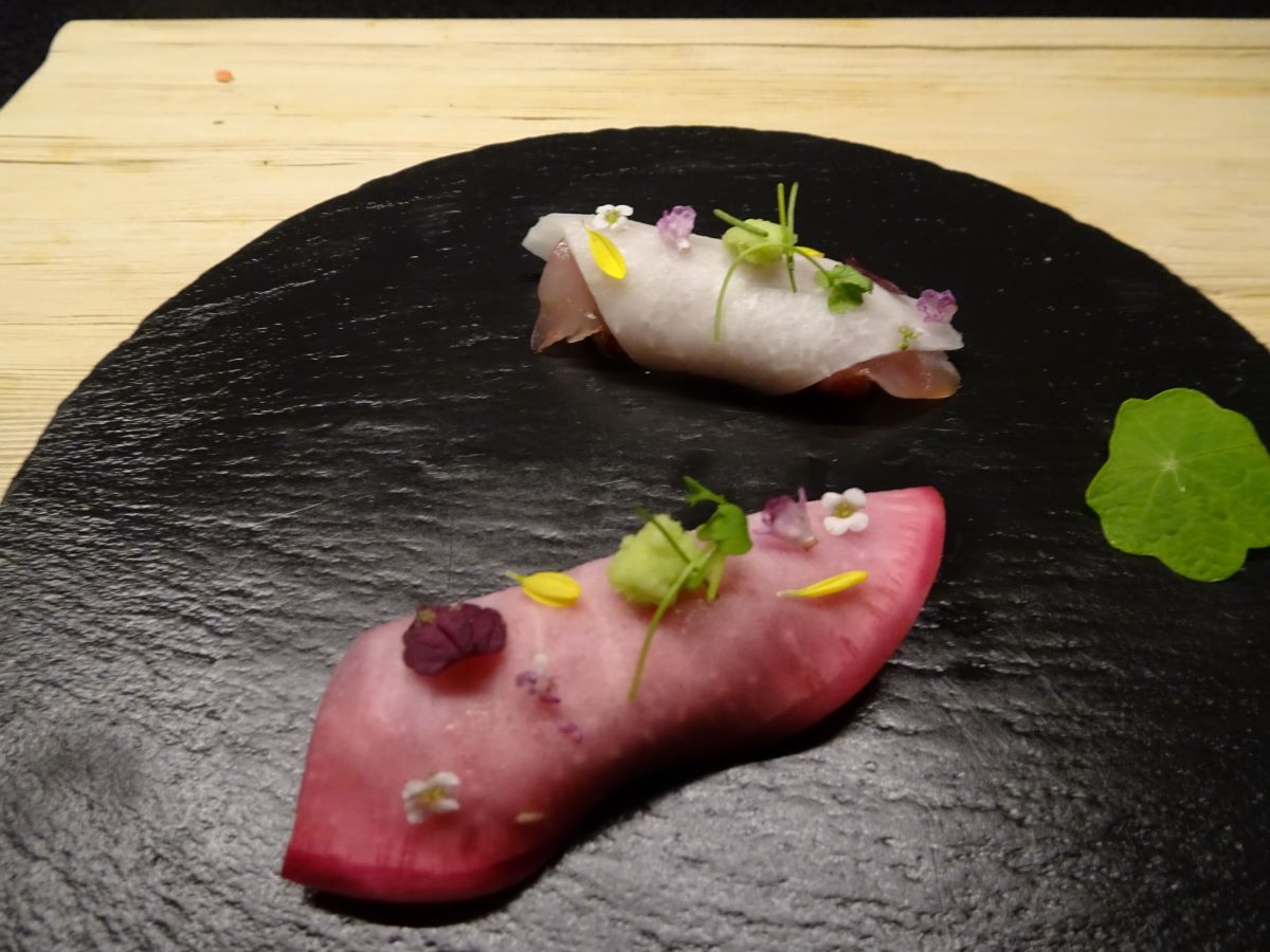 次は「金目鯛」とある。紅白の千枚漬けでくるんだ金目鯛の昆布締めと、なんと桜肉(馬肉)だ。ふたつの複雑な旨味を引き出し、食感もアクセントとして楽しむ絶品だった。ワインが進む。