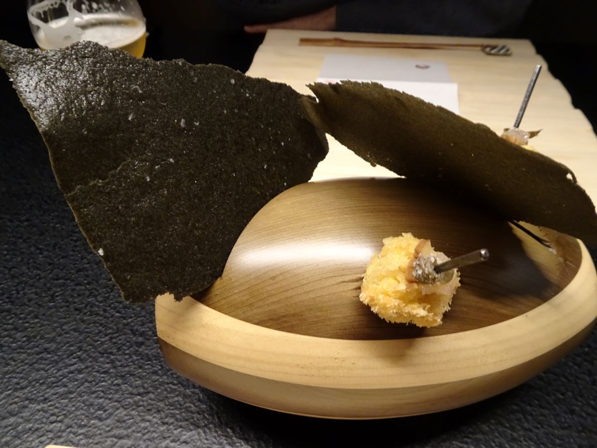ペアリングの1杯目は前菜に合わせたシャンパンなのだが、意表をついて、先にビールを注文した笑。ちょっとしたイタズラ勝負みたいなものかな。すると、ビールと一緒に、見事にアミューズを出してきた。お品書きにない別の1品だ。それは小さな「白子のフライ」だった。あの客はビールできたかぁ、なら「これでどうだ」と、つまり彼がボールを打ち返したように思えた。