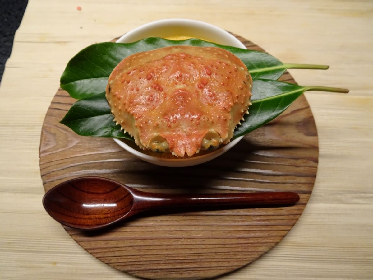 そして、お品書きの4品目に並んでいたのが「香箱蟹」だった。香箱蟹の地元の人間としては彼がテーマのひとつに選んでくれたことも嬉しいが、まずは、どんな料理に仕立てるのかの方に興味がわいていた。出てきたのは、香箱蟹の全てを詰め込んだ「フラン」だった。蟹身、内子などを味や食感を残して詰め込み、濃厚な味にまとめたフランの上に、蟹のスープをムースの泡にしてかけてある。形は茶碗蒸しに似ているが、食感はプリンのようにしっかりした滑らかさだ。フレンチ独特の見事な逸品だった。
