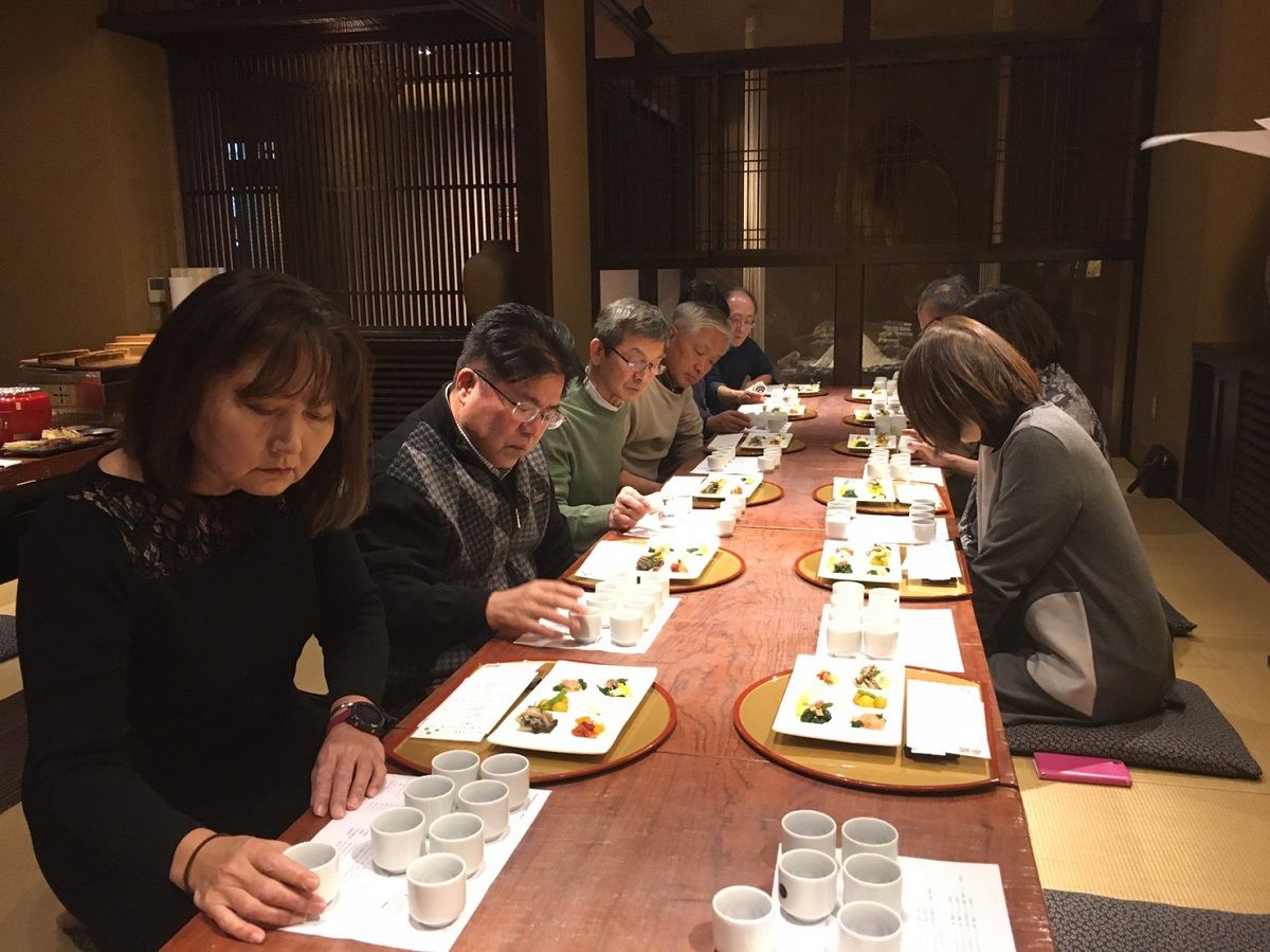 会のスタートは、まぁ儀式のように「酒を利く」時間です。少量づつ感覚を研ぎ澄まして、違いとか好みを探す感じかなぁ。それぞれの日本酒の特徴なども解説します(そのために酒の師匠も参加します)。途中で、つまみを少量味わって味覚を整えたり、いわゆる「やわらぎ水」で口をリセットしたり、まぁけっこう本格的な時間なのですが、いつも笑いやトチリがあって楽しい時間です。