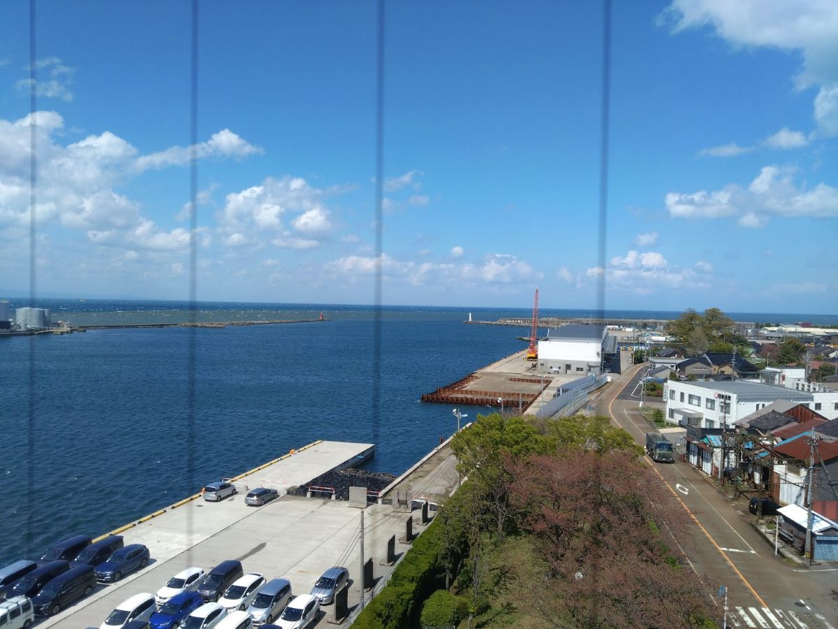 桜並木に高い展望台(の建物)を見つけて上まで登ることにした。ところがエレベーターはなく階段をひたすら上がるしかない。66歳を殺す気か~、っと叫ぶ頃にようやく展望スペースに着いた。足はガクガクなのだが、見渡す景色は壮観だった。やっぱり海は気持ちがいい。