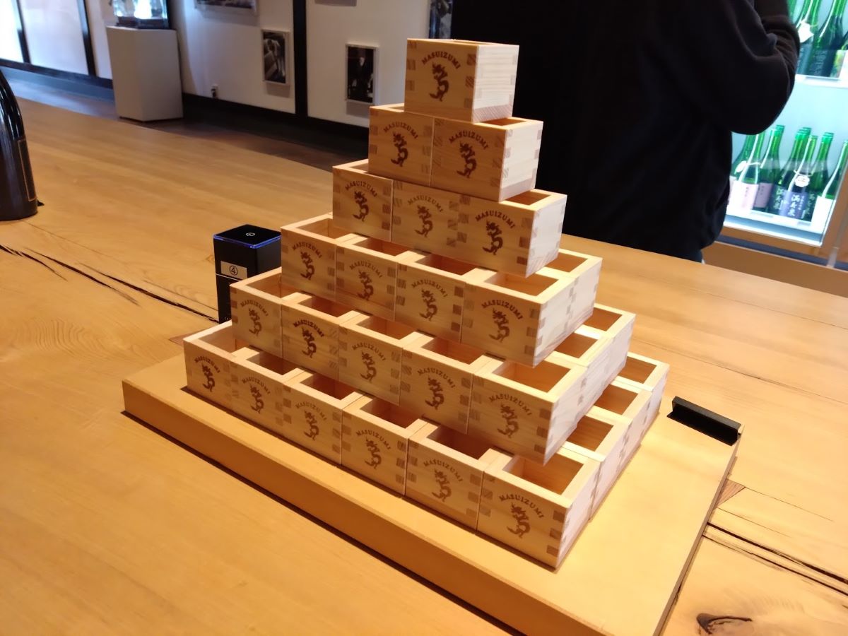 まず酒が並ぶ3台の冷蔵ショーケースの説明だ。左の冷蔵庫には日常的に楽しむ満寿泉(まぁ安い商品のグループかな)、真ん中が季節品や企画品のグループ、そして右手のやつが満寿泉の代名詞、つまり高級品のグループだ。有名な「寿」やそのビンテージ(古酒)も並んでいる。そこから好きな1本を自分で出して、テーブルの目の前に置き、グラスに注いで味わい、それを好きに繰り返すのだ。