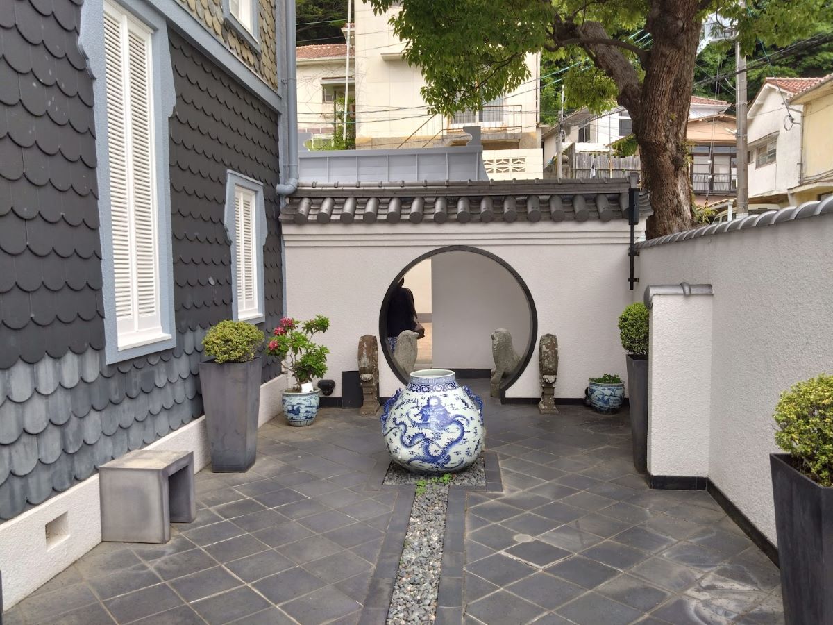 山の一番上にあった最初のやつは「坂の上の異人館」という名前で、シノワ(中国系)の館だった(ある時期は中国領事館だったようだ)。だからちょっと異質で面白い。この後は、有名な「うろこの家」まで3軒を順に巡るつもりだ。この4軒は事前にHTくんが見つけたルートだった。で、1軒目を出たとき、ちょうどタクシーが停まり、女性チームが降りてきた笑。そうか、彼女たちも同じルートらしい。やっぱりなぁ、上から順に坂道を降りるルートだからラクチンなのだ笑。