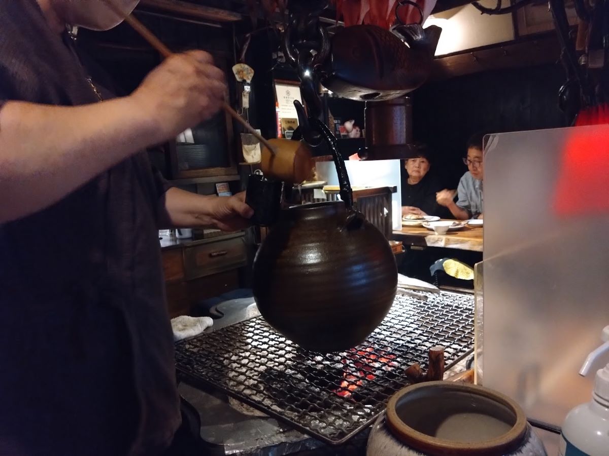 そして酒だ。ぬる燗を頼むと、炉に吊ってあるカメ(中に地酒が入っている)のフタを取り、中の酒(絶妙な温度だ)を、柄杓(ひしゃく)ですくい、湯呑に注いでくれる。昔からのスタイルの、この酒が僕の目当てのひとつだ。僕はおかわりのグラスを、いや湯呑をぐいぐい重ねた。