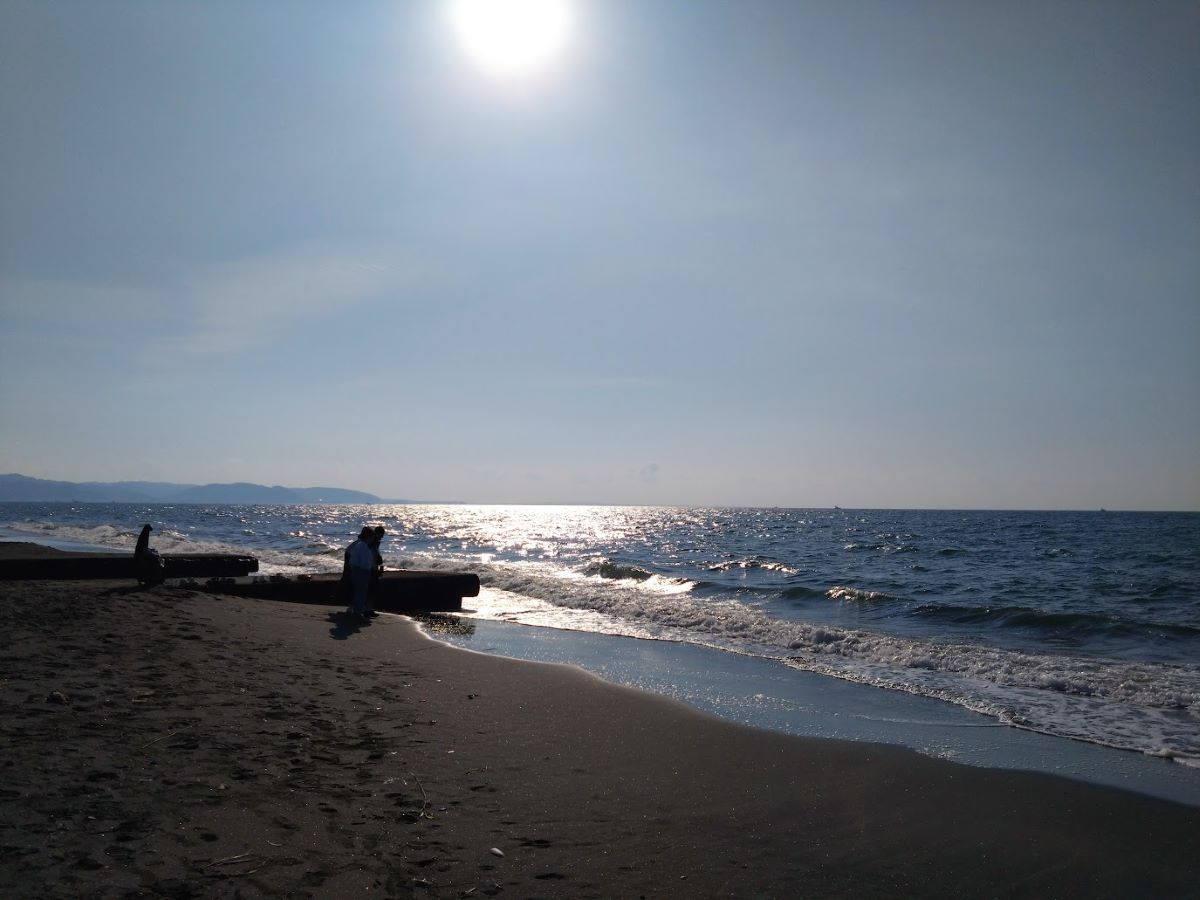 食べたあと、僕たちは店を出て、目の前の海岸へ降り、波打ち際まで歩くことにした。海岸の砂は黒っぽくて、波の白さが目立つ感じかな。右手には江の島があるのだが、左手の太陽はまだ低くて、朝の陽射しが優しい。