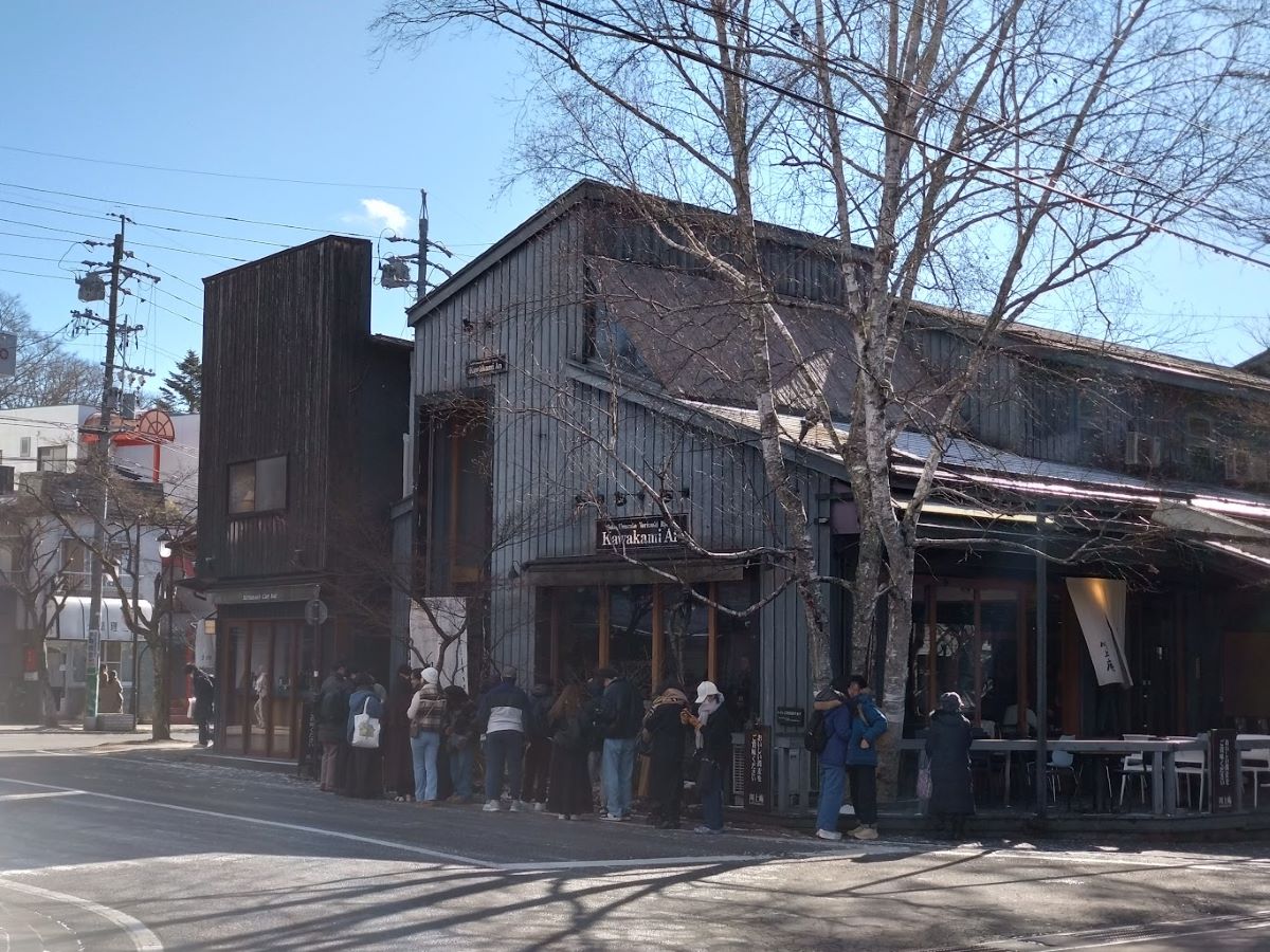 向こうの旧軽通りには、シニアの観光客が多いのだが、こっちのロータリー辺りは、比較的若い人たちに人気のエリアってことかな。さっそく、蕎麦の川上庵の前には長い列が付いていた。蕎麦屋なのにテラス席もあって見た目はカフェみたいでちょっとかっこいい。