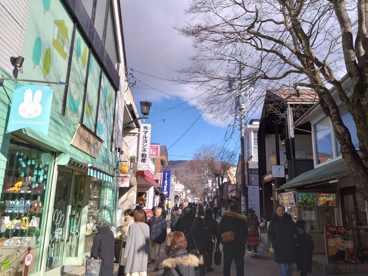 さて、定番の混雑エリアの散歩は早々に終了だ。ジジババは尻尾を巻いて宿に戻ることにした。宿に向かう帰路、タクシーの正面に、冬の浅間山が見えた。青空の中にくっきり立つ姿は美しかった。ジジババは、なぜかホッとする笑。