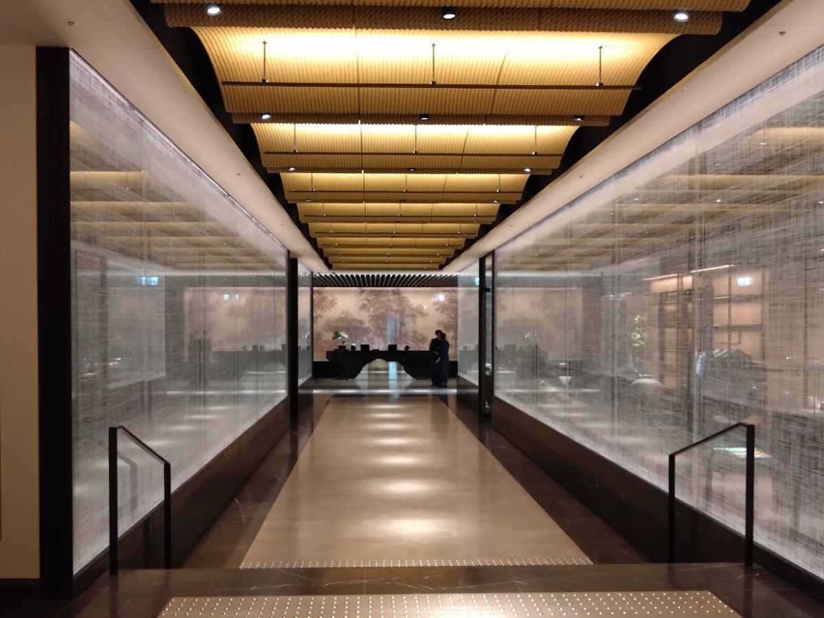 威圧感がある自動ドアが横にす~っと開くと、ホテルへの広い通路が現れる。突き当りの正面に見えるオブジェのあたりがホテルのロビーのようだ。壁や天井の質感も上質で、照明も雰囲気もガラリと変わるから、ちょっと背筋が伸びる感じだ。
