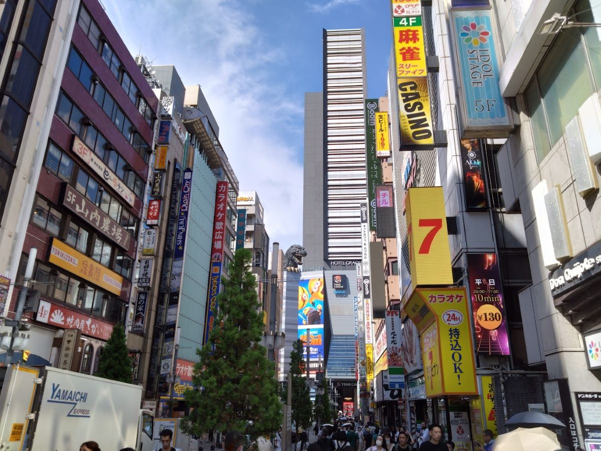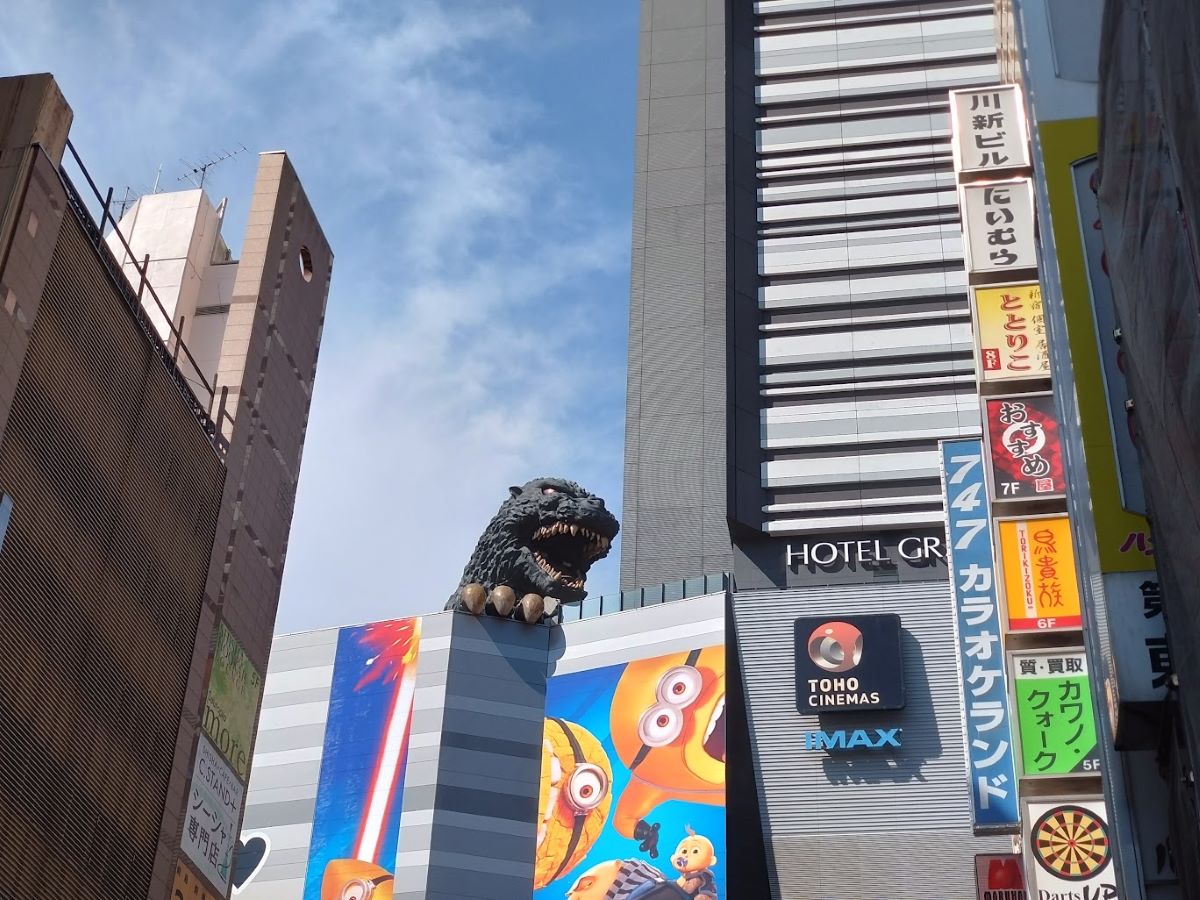 次は、炎天下の靖国通りを歩いて西のセントラルロードへやってきた。今ならゴジラロードと呼ばれる道だ。その突き当りに「ゴジラヘッド」がある。シネコンビルの上に設置されたゴジラ頭の大型オブジェの愛称らしい。ここがTOHOシネマズ(新宿東宝ビル)、いわゆる「トー横」の語源となったビルだ。