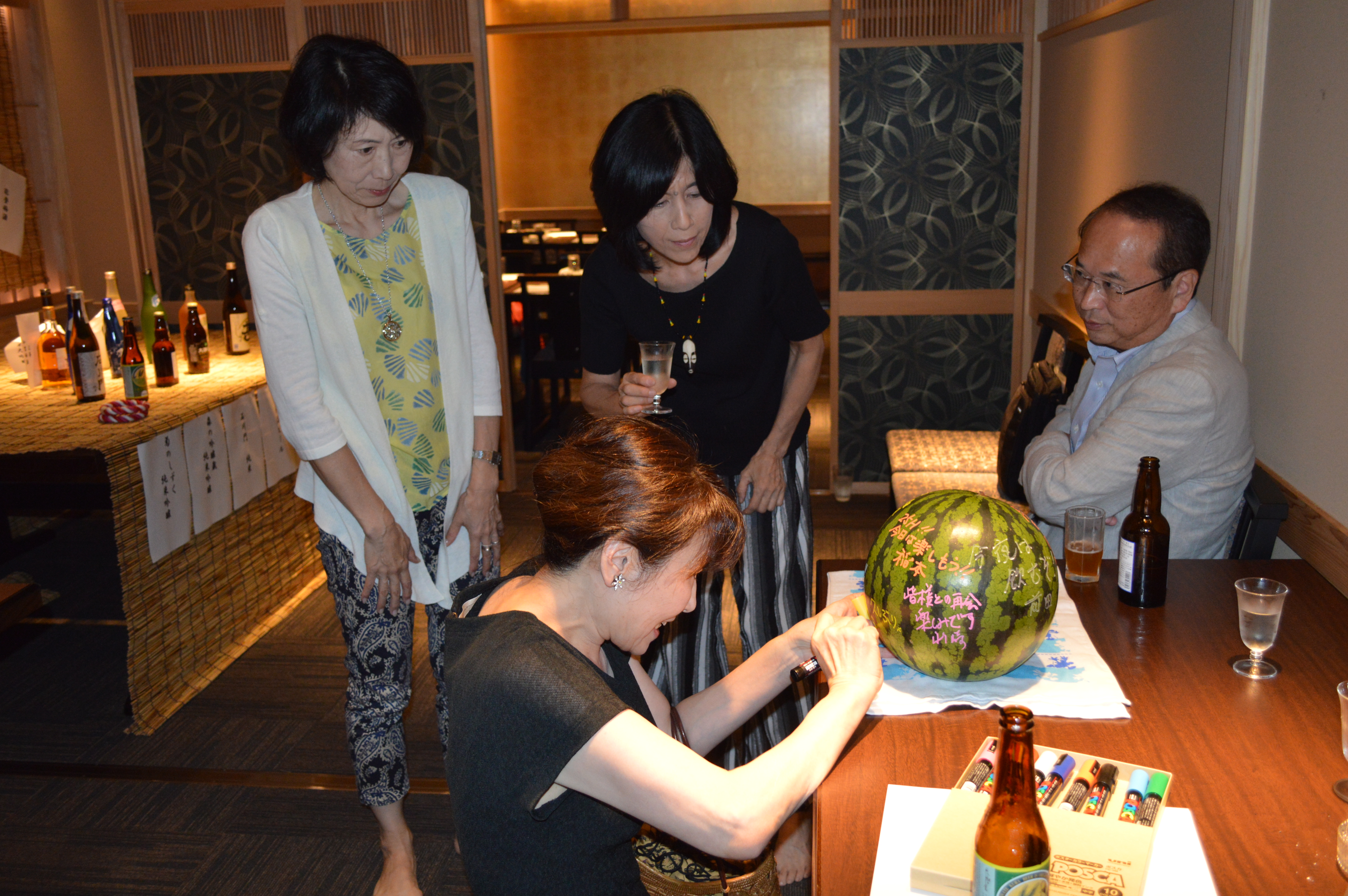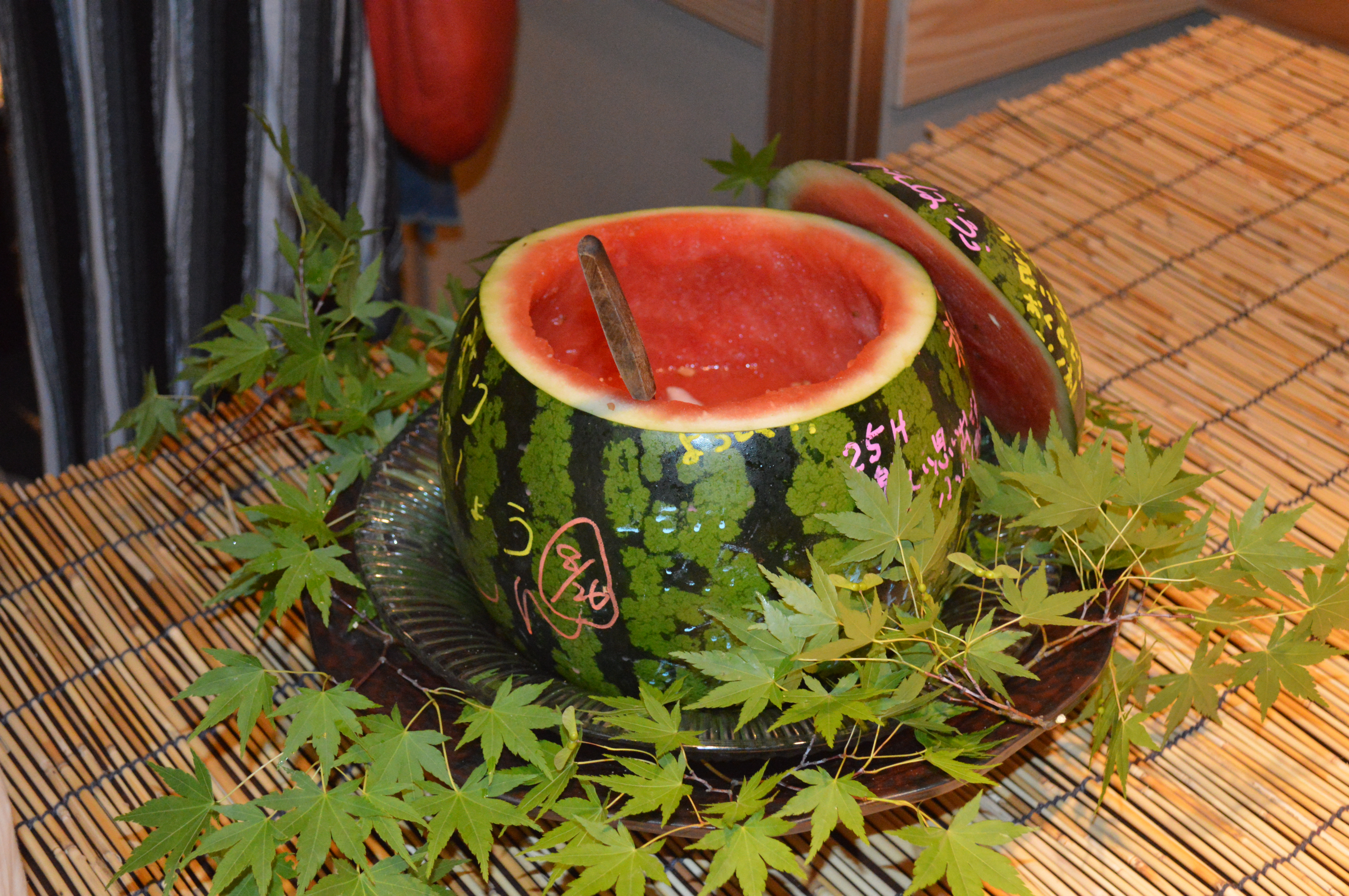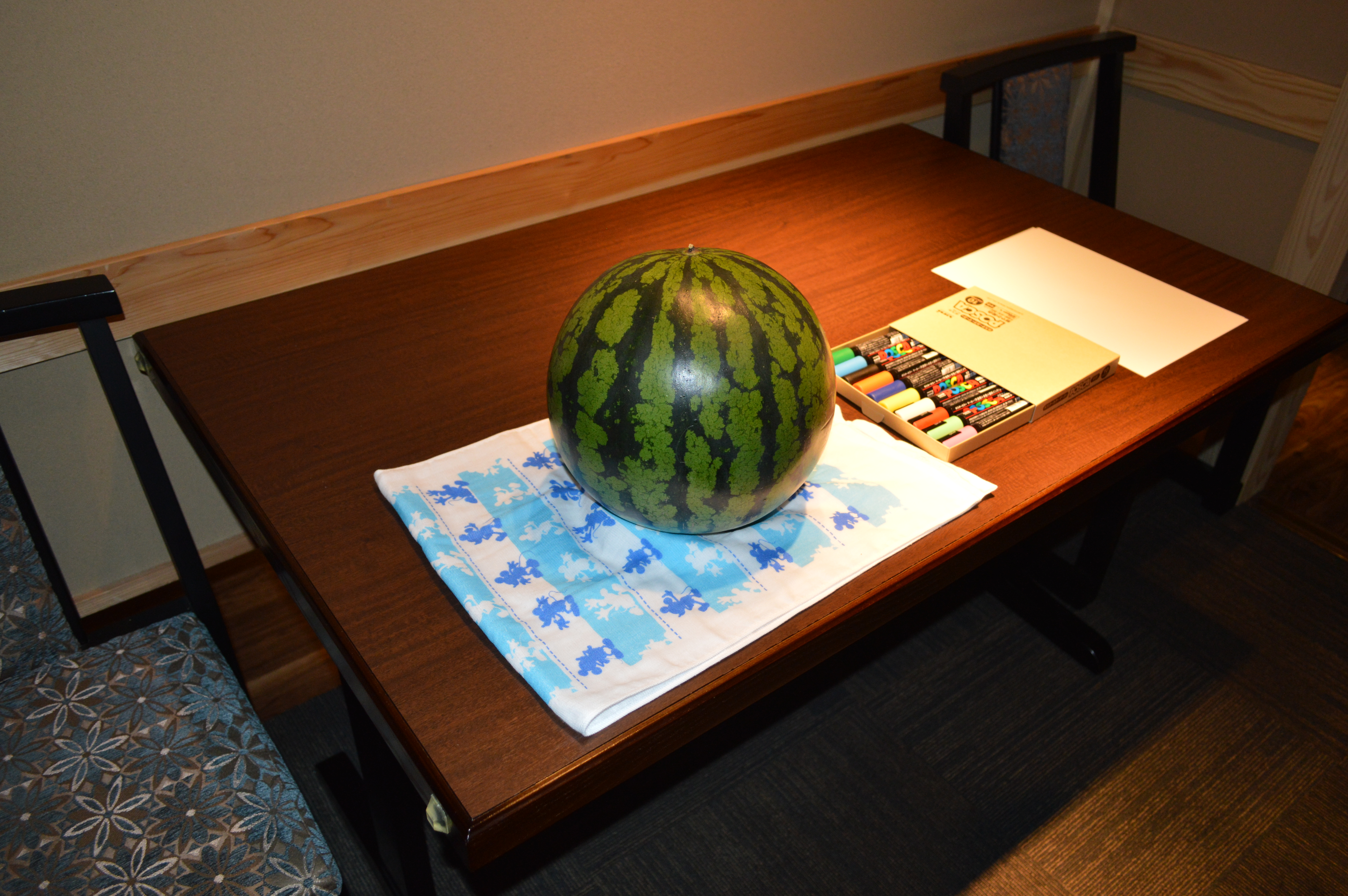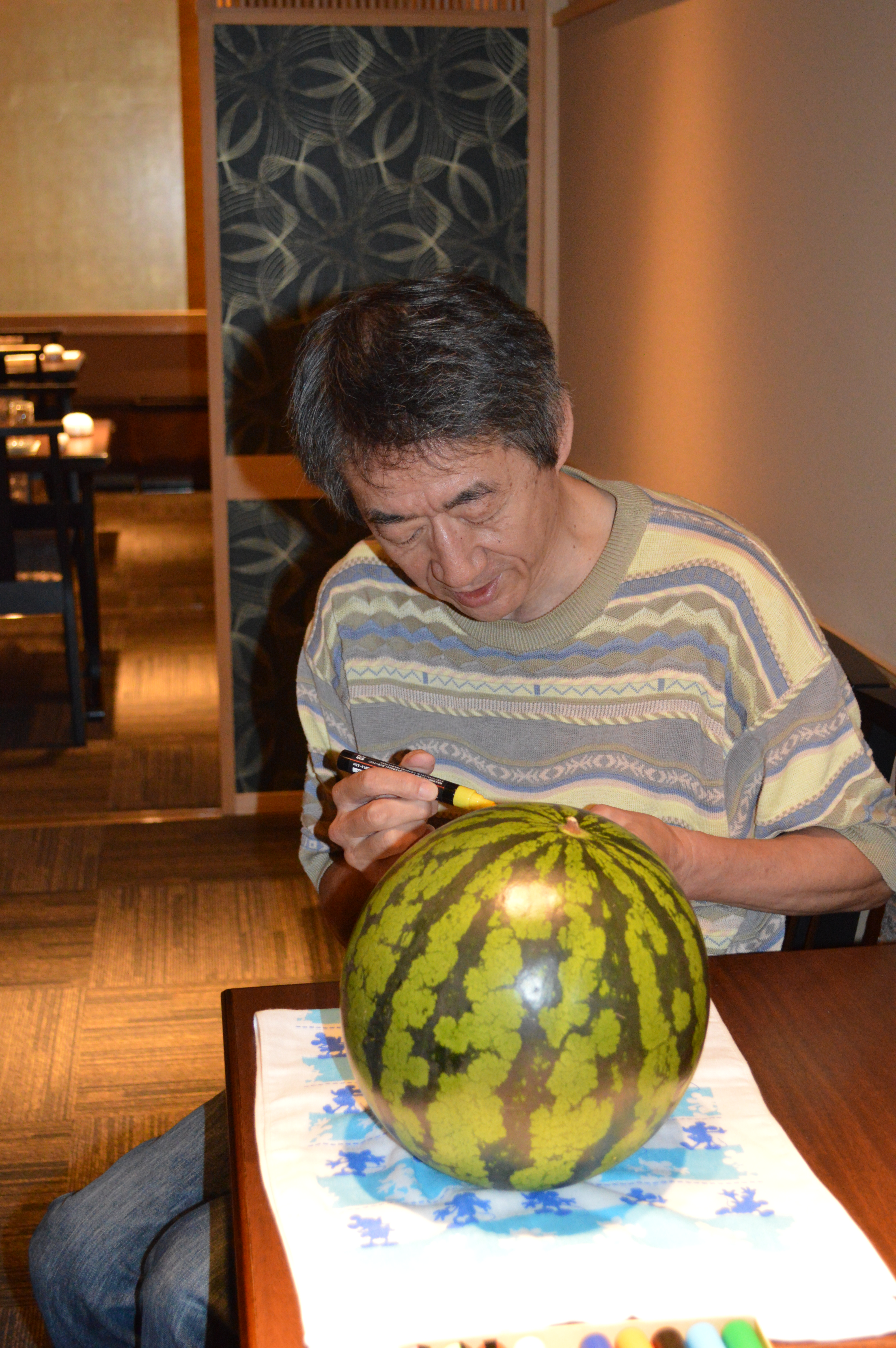 写真順 3 ◇寄せ書き用に用意された大玉スイカ。後ほどフルーツポンチに。