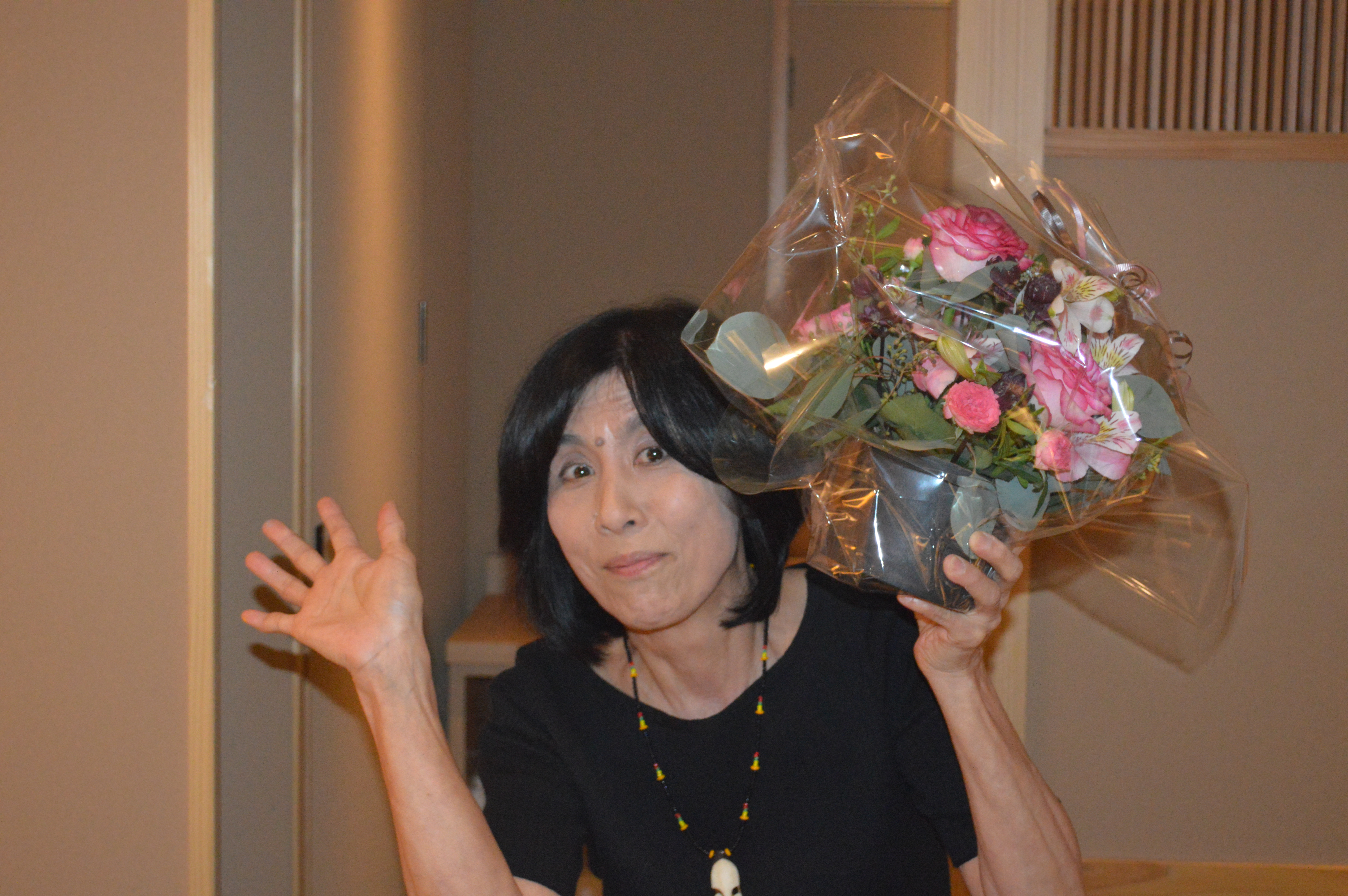 写真順17 ◇同窓会の日が誕生日だったH本K子さん。花飾りをもらい感激でした。