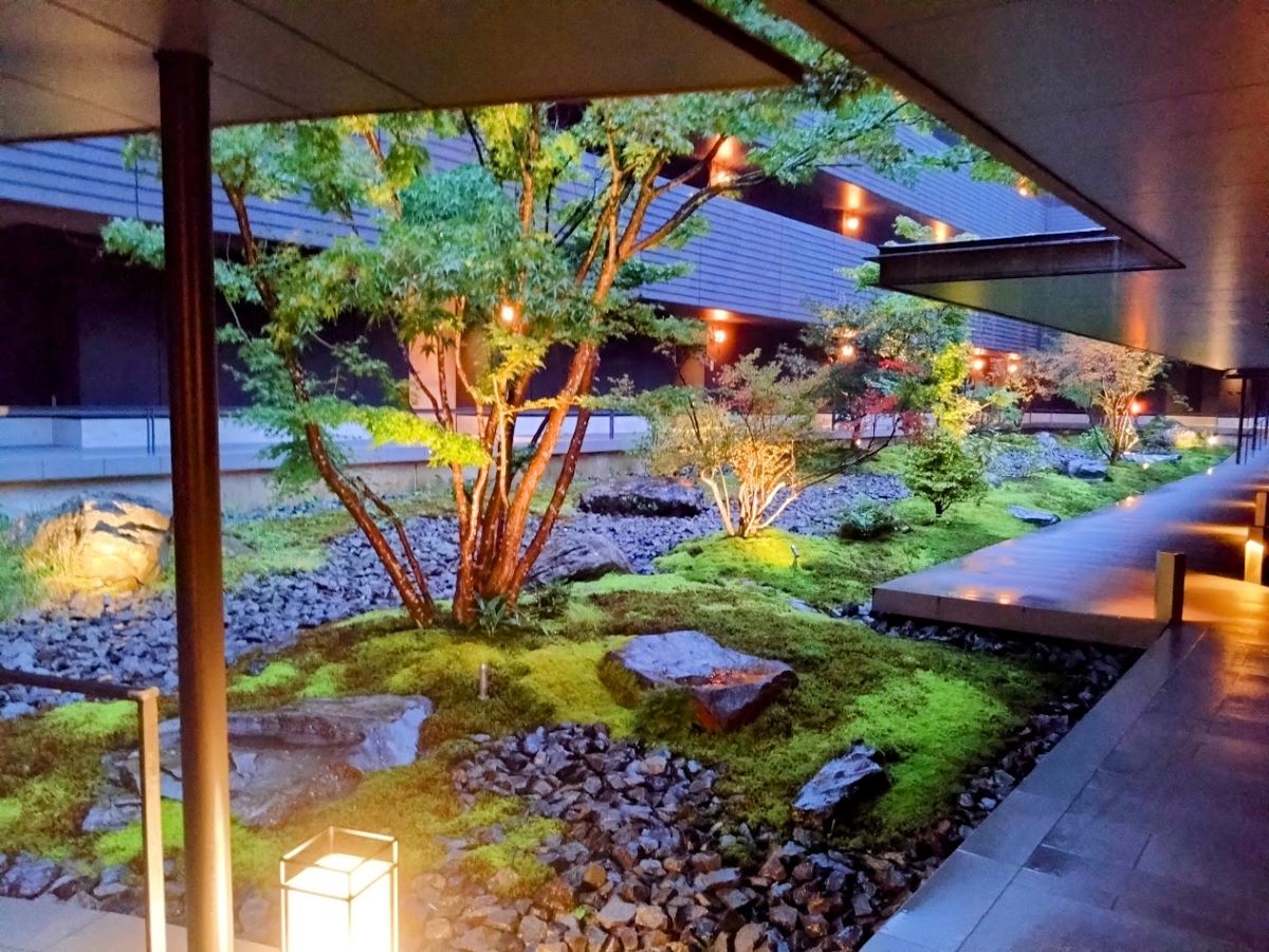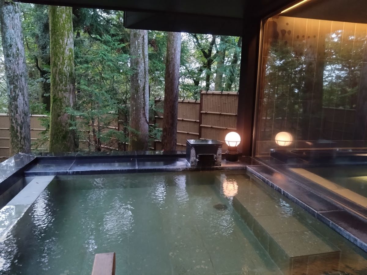別の若い男性スタッフが、泊る部屋の中までエスコートしてくれる。細かく丁寧なガイダンスだ。先導する彼はたびたび立ち止まって館内を説明する。ロビーがある建物から外へ出ると素敵な中庭で、その外廊下を右へ進むと3階建ての客室棟だ。反対の左手の外廊下は緑の木々に向かうようになっていて、やや下るように進むと露天風呂(大浴場)らしい。