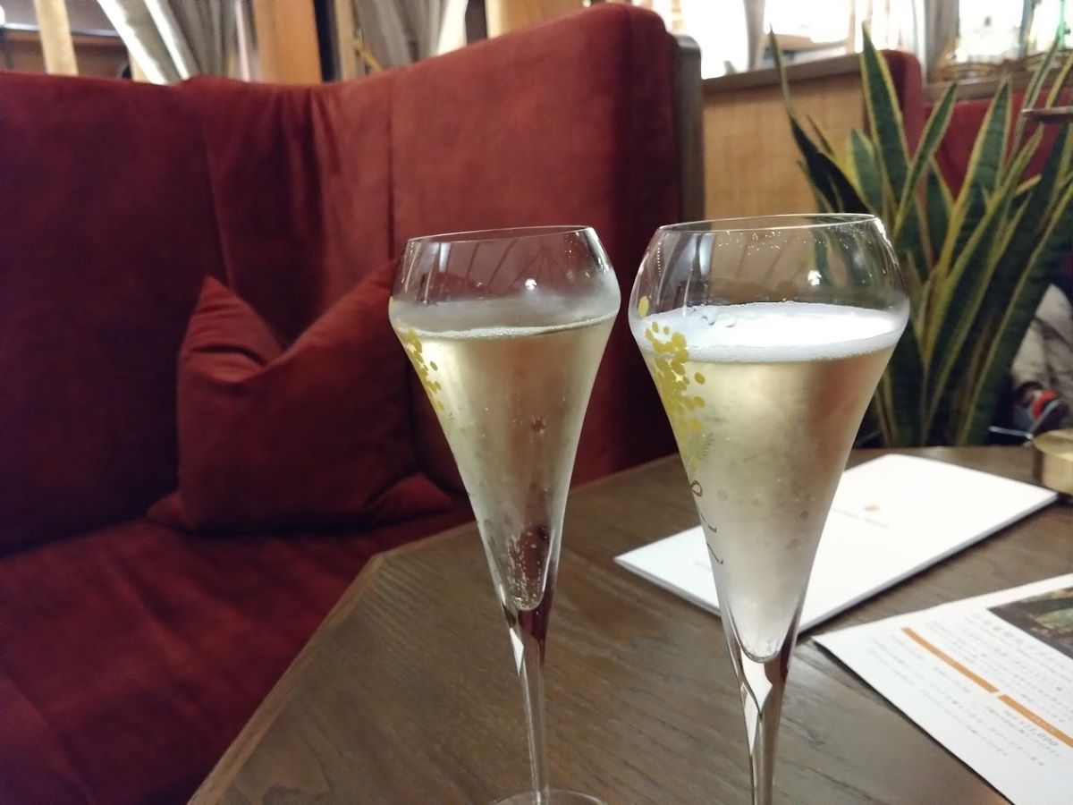 お疲れの僕たちはソファー席にどさりと座って、暖炉で揺らぐ小さな炎を見ながら、おすすめのシャンパンを飲んでしまった(旨いからお替りした笑)。まぁ何杯飲んでも構わないのだが、そろそろ夕食の時刻だ。先にひと風呂浴びてこようと思う。
