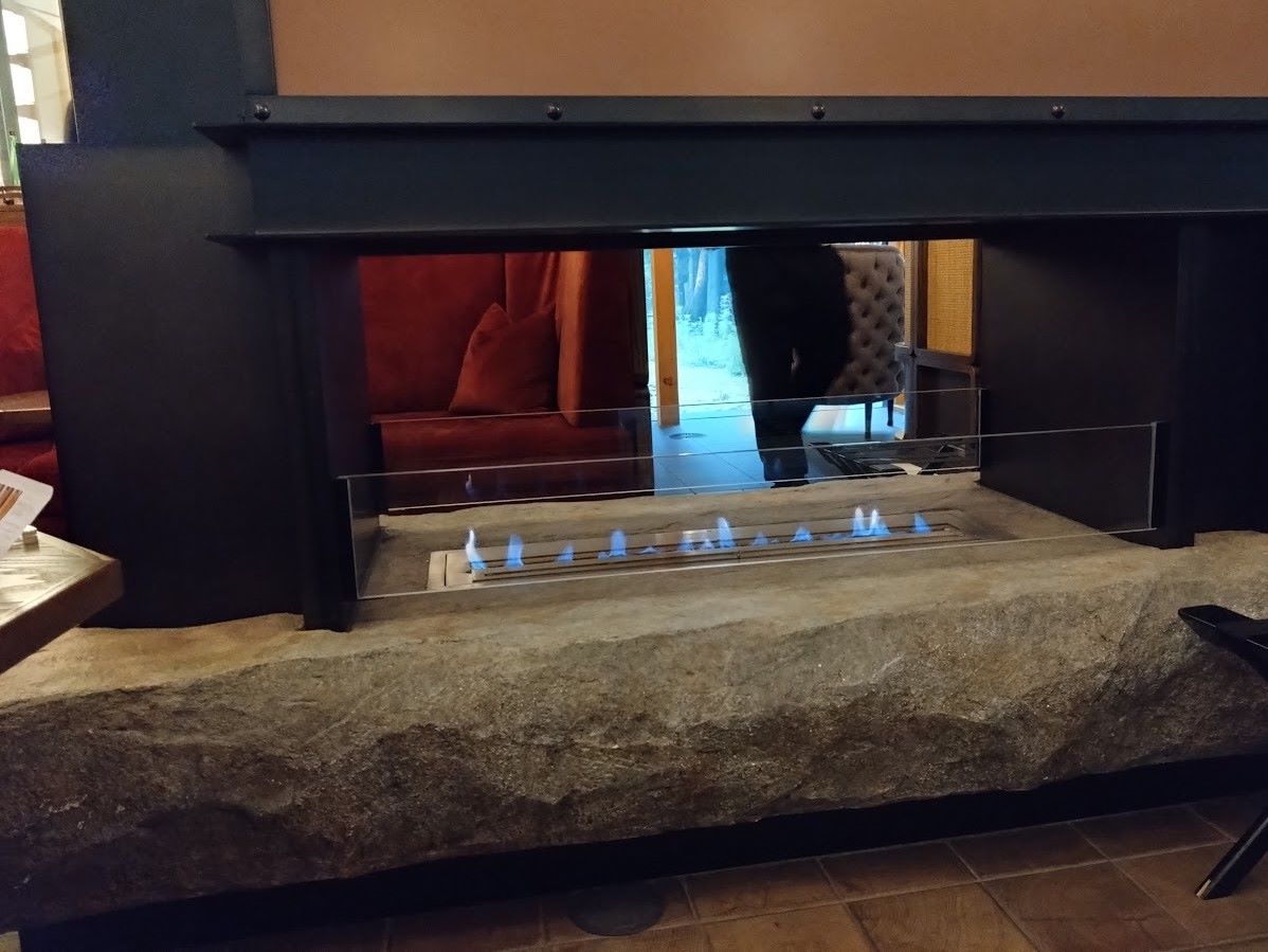 庭側のテーブルからの眺めもよさそうだが、中央の暖炉を囲むソファー席に惹かれて座ることにした。大谷石(栃木で採掘される石材)のデザイン暖炉だ。まぁ薪ではなくエタノールの炎だから、インテリアかな。