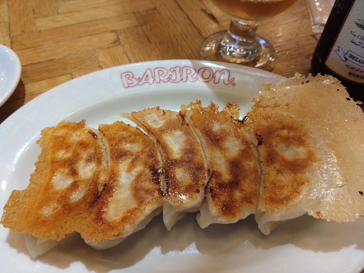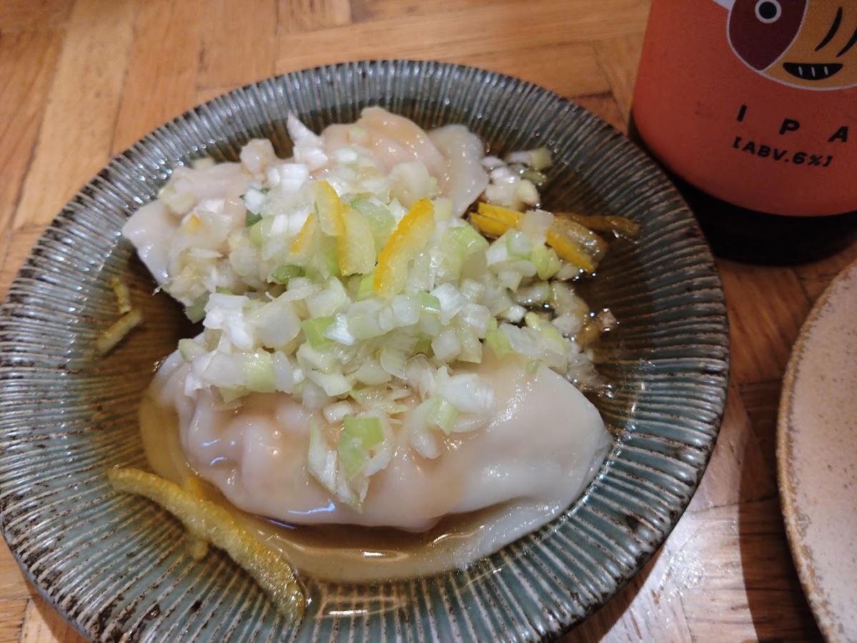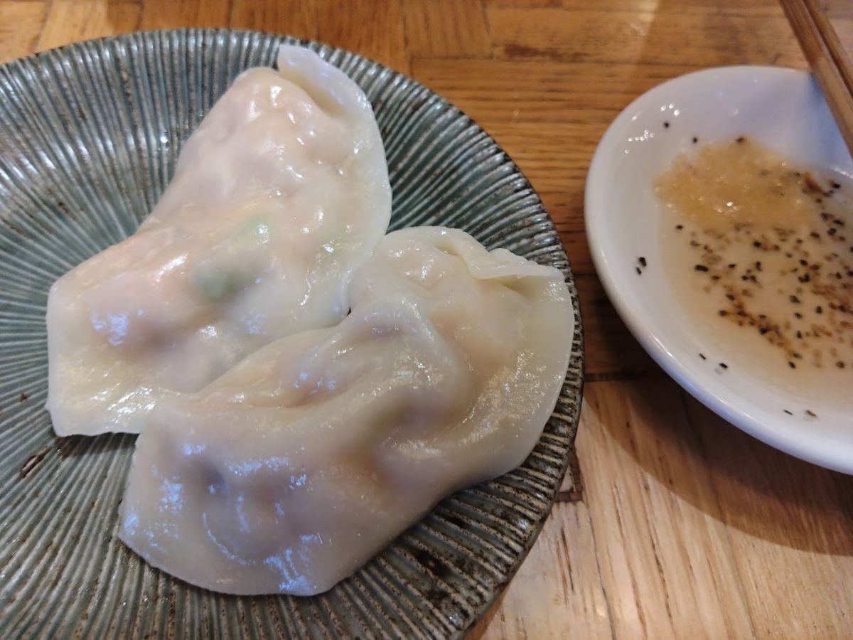 どうやらランチタイムが終わり、ディナーメニューに入れ替わる時刻らしい。ランチの単位は2個なのだが夜は5個になるそうだ。だから、焼き餃子をお替りして、変化球のやつ(柚子と生姜、クルミカレー)も頼んでみることにした。