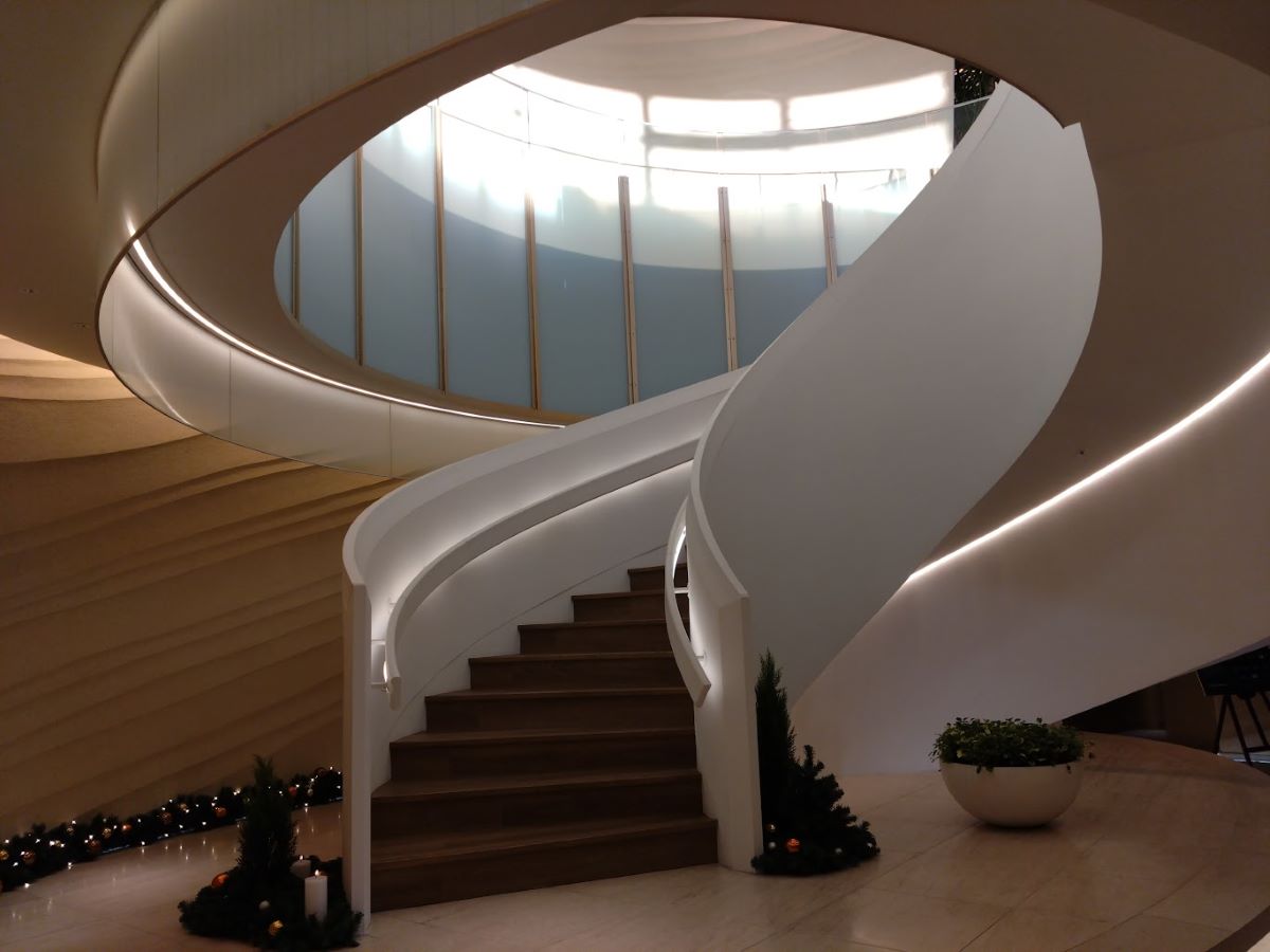 1階入り口の広い風除室を抜けると、目の前に特徴的な(とても独創的な)らせん階段が現れる。なんだこれ?と思うほど異形の階段だ。どうやら1階にあるのはこのエントランス部分だけでフロントは2階にあるようだ。横のエレベーターは使わないで、このらせん階段を登ってみたくなった。