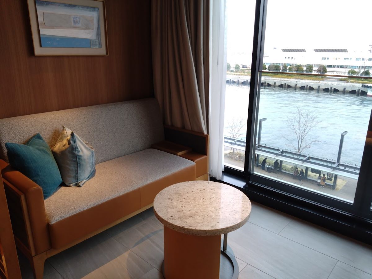 客室は、想像よりはるかに広くて驚いた。インテリアもシックで落ち着いているのだが、ちょっと観察すると「船の客室」を想起させるアイデアが散りばめられている。まぁ上質だけど、どこか楽しい感じかな。