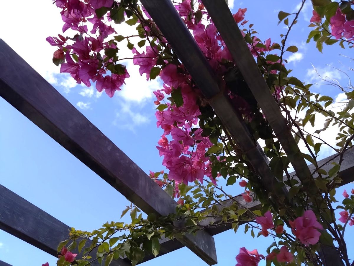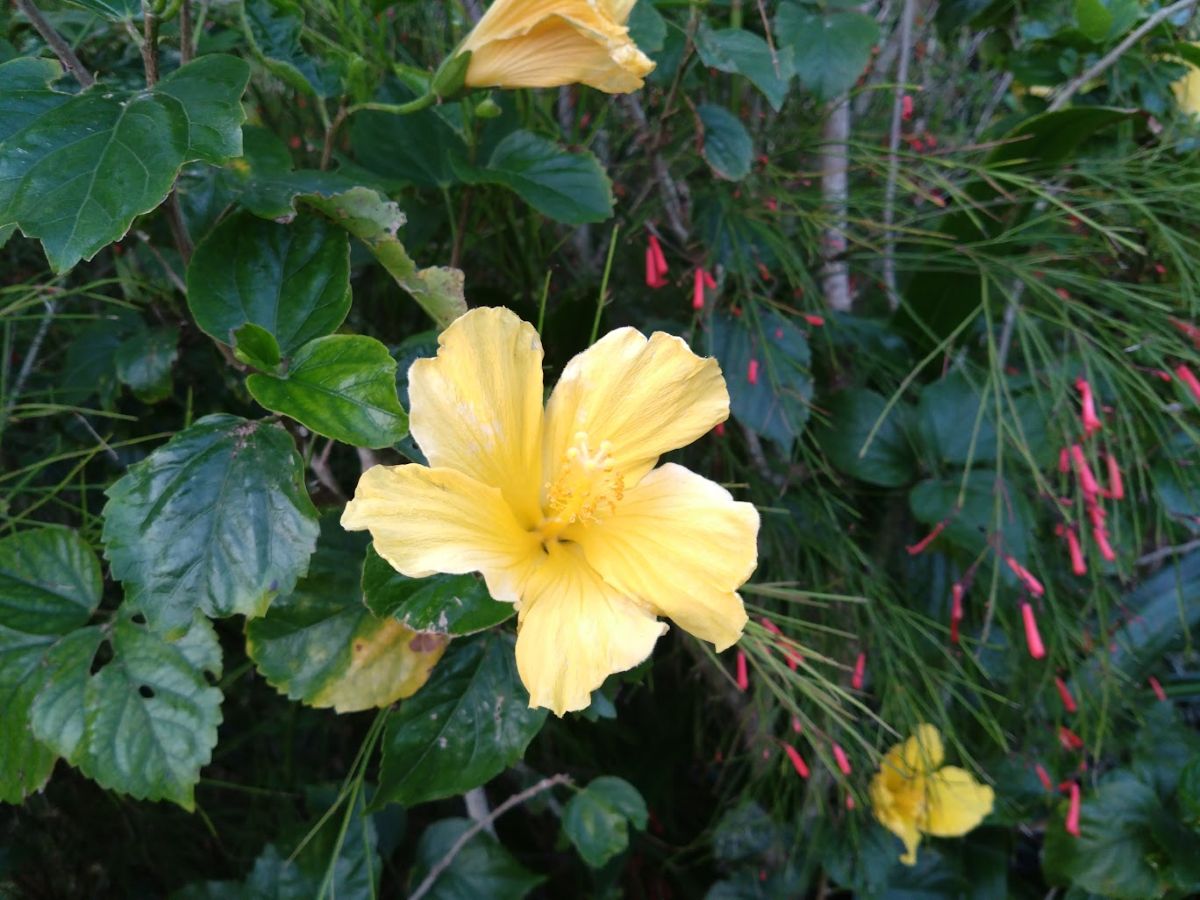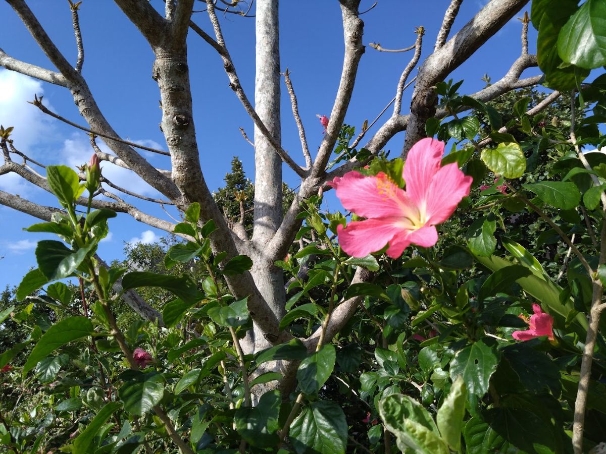 玄関側はグスクに囲まれた木々と花々の庭だから、当たり前のように鳥たちの遊び場所になっているのだ。自然は、大事に守ればこんなに嬉しいお返しをしてくれる。山側のグスクウオールの上に、ちょうど太陽が顔を出していて、木々や花畑を照らし始めていた。