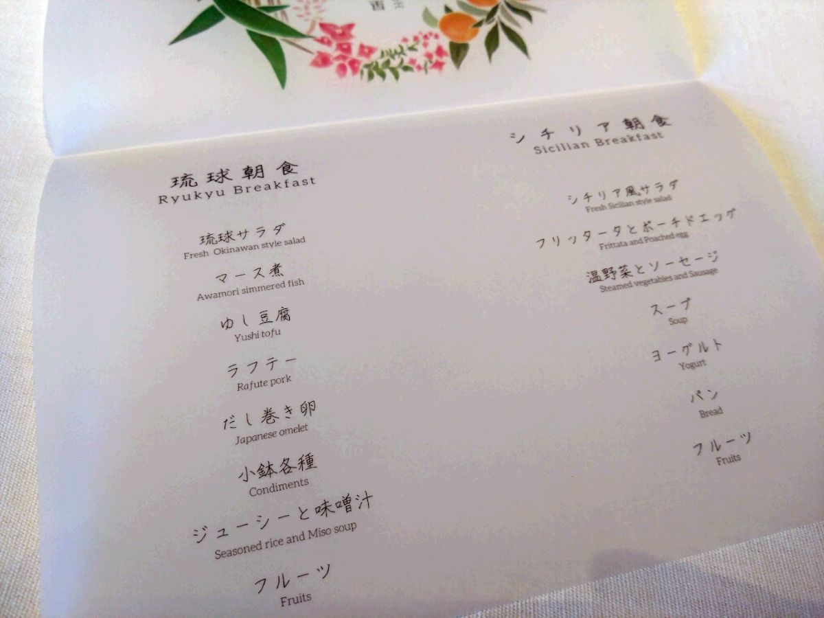 朝食は2種類、沖縄ごはんとシチリアごはんが選択できた。二人だが別々に選んで良いそうだ。もちろんそうする。