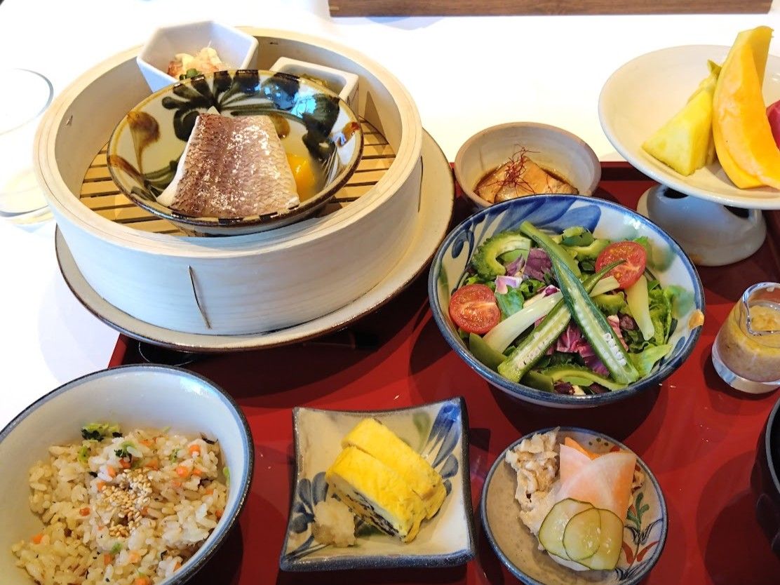 沖縄ごはんには、ゆし豆腐やラフテー、魚介と野菜(げっとう)のマース煮(マースは塩のこと)、そしてジューシー(炊き込みご飯)などが楽しめた。どれも優しい味だ。シチリアごはんは、いわゆるイタリアンで、フリッタータとポーチドエッグが美味しかった。