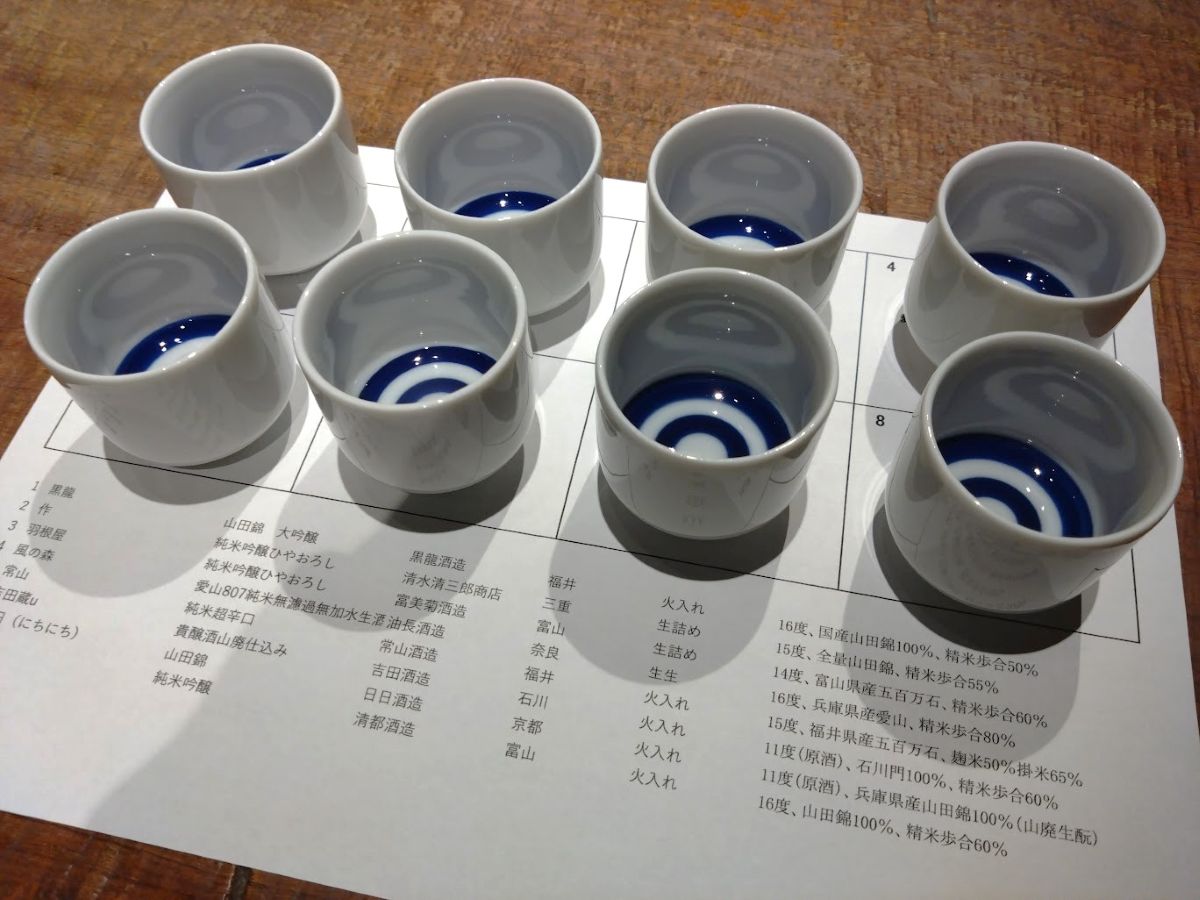 いよいよ定刻だが少し遅れる人もいるから、先に恒例のお勉強タイムを始める。利き酒の前に、それぞれの詳細やポイントの説明を聞いてもらう時間だ。酒米の違いや精米歩合、度数の違い、生詰や生々、蔵元の特徴、最近のトレンド事情・・・そんな情報かな。ちなみにLINEに出てきた「醸す白山」を外した理由もお話した。