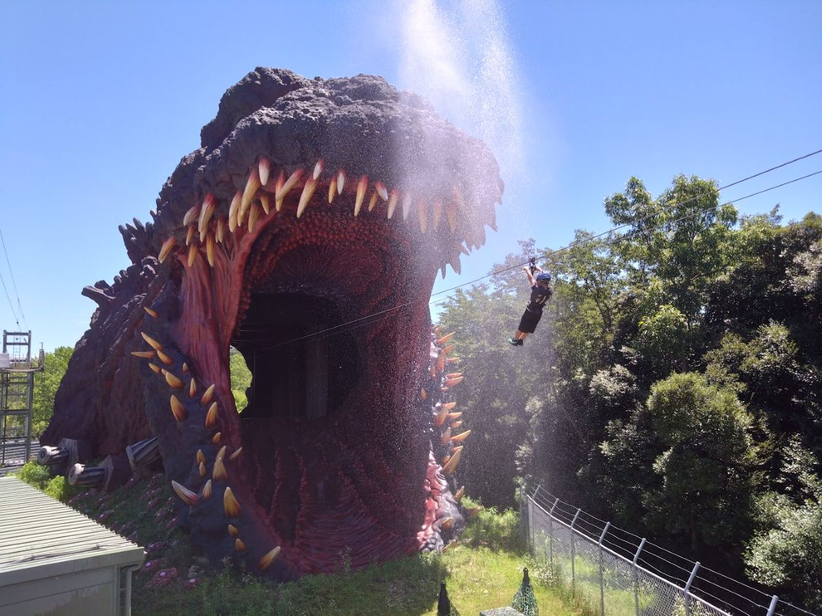 谷の向こうには大きく口を開けたまま活動停止している巨大なゴジラがいる。ようやく準備が整って、やぐらの上から谷を渡る滑空がスタートした。口の中へ飛び込む瞬間、大型のウォーターキャノン(大砲)が炸裂して、全身ずぶぬれになる。まぁそんな楽しいアトラクションだ。