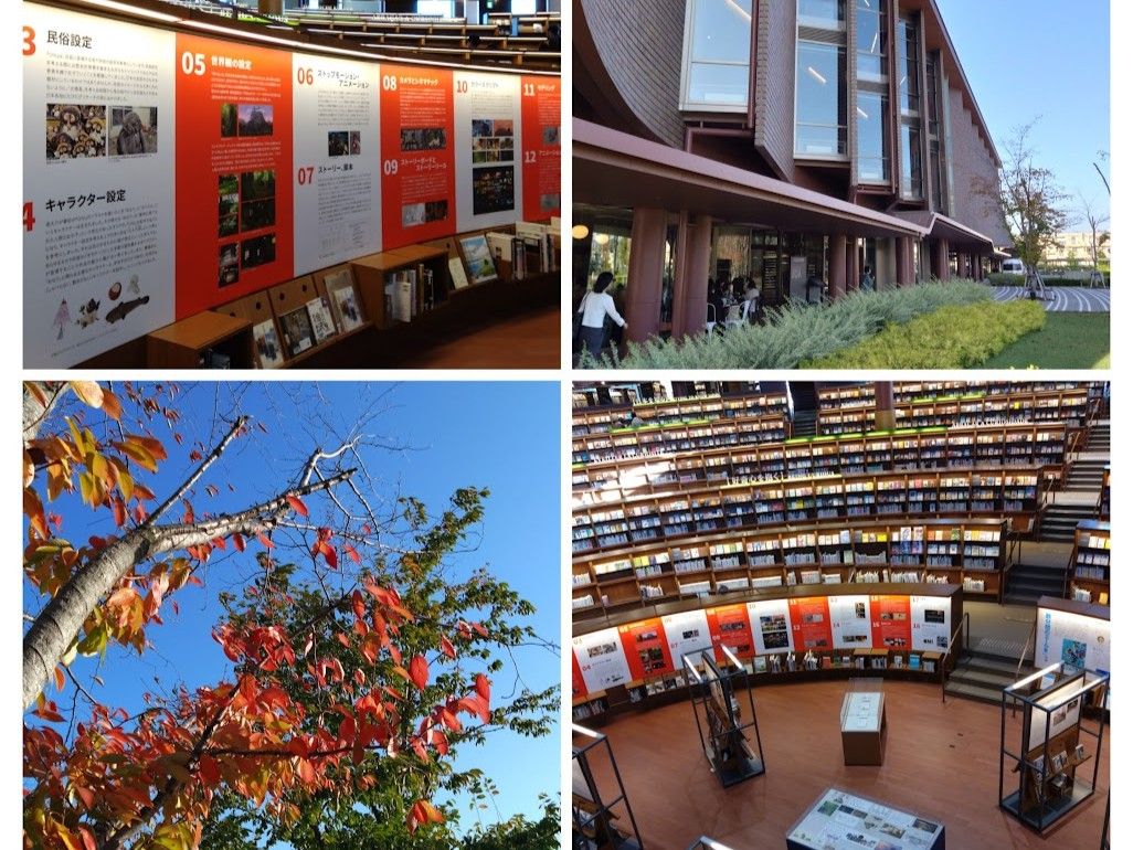 図書館なのに、歩き疲れたのかもしれない。そういえば・・・と外へ出てみたくなった。1階のカフェは大行列だったからドリンクは諦めたが、芝生の中のベンチはなかなか魅力的だった(ここは読書の庭という名前らしい)。金沢美大側の木々は少し色付き始めて、眺めもいい感じだ。