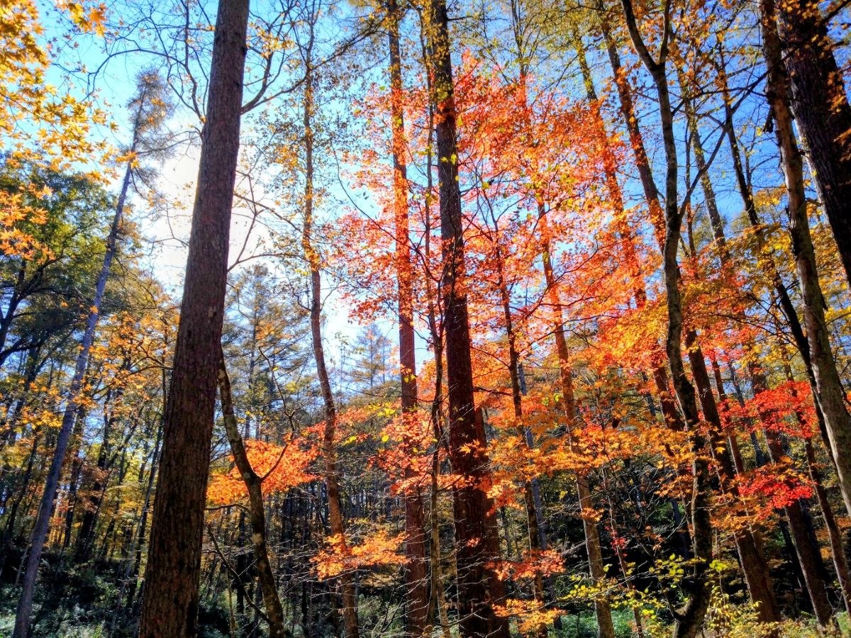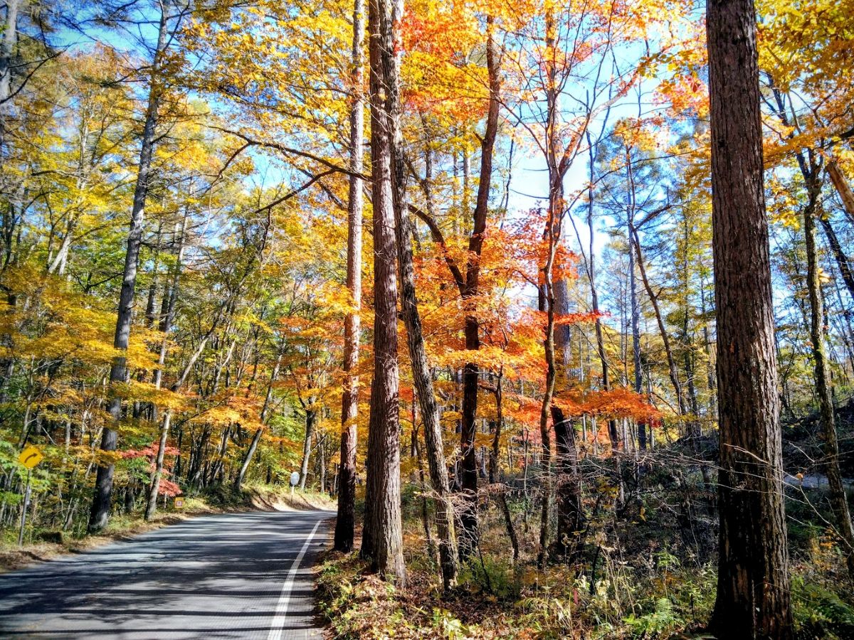 ここあたりは長い下り坂がくねくね続く。そして左右の木々がどんどん色付いていくのがわかる。山の上よりこっちの方が紅葉がきれいなのだ。おばさんスタッフの顔が浮かんだ、ありがとね笑。