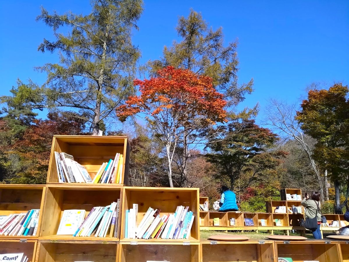 この日のイベントはふたつ。まずは「サケテラス」だ、ようするに地酒の試飲会らしい。無料なのだがドライバーの僕は断念するしかない笑。そして広場では「紅葉図書館」が開催されていた。芝生の丘陵に(つまり屋外に)本棚が設置され、誰でも自由に読書を楽しむイベントだった。なかなか面白い。