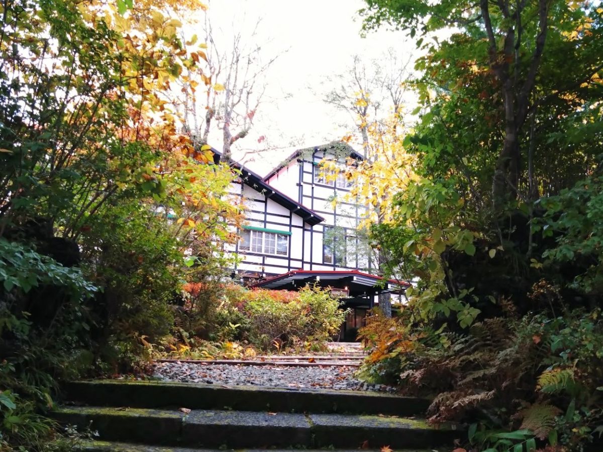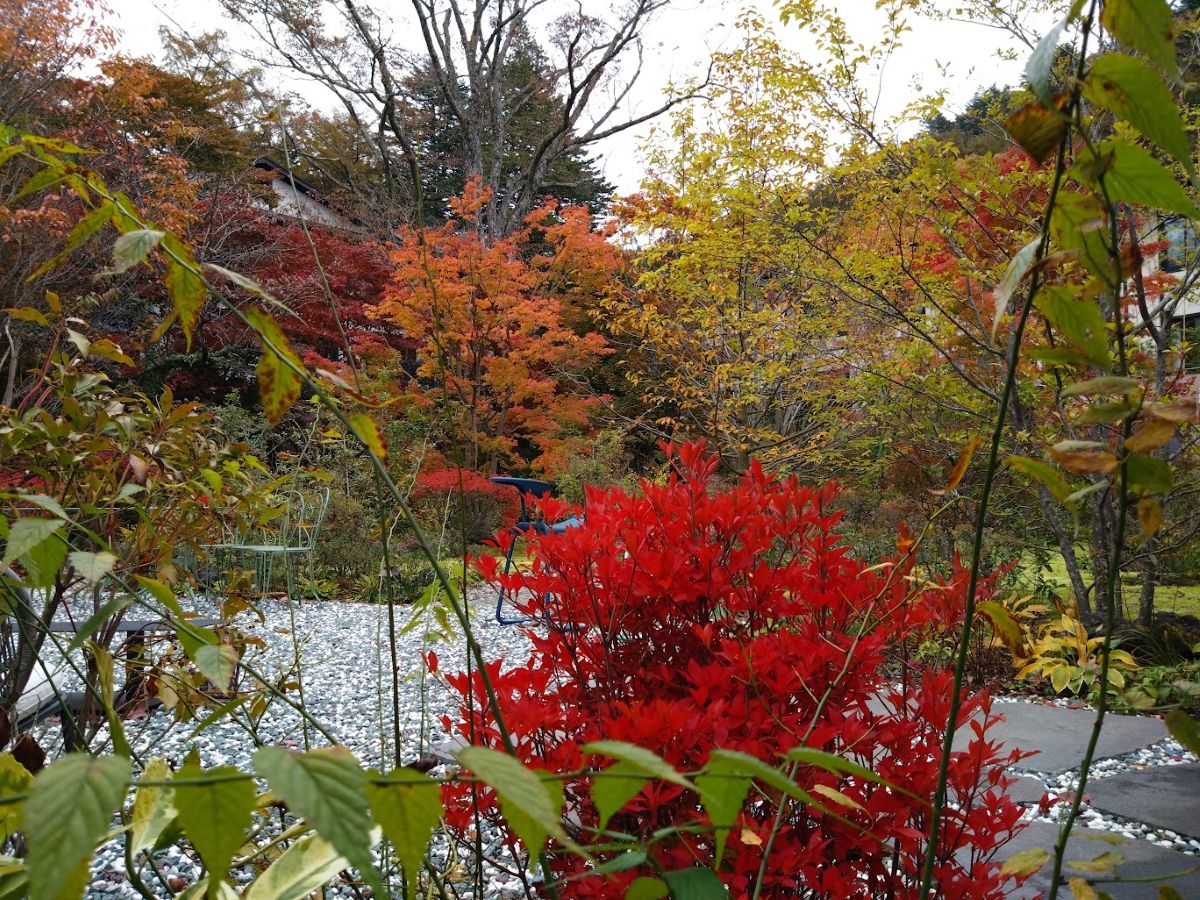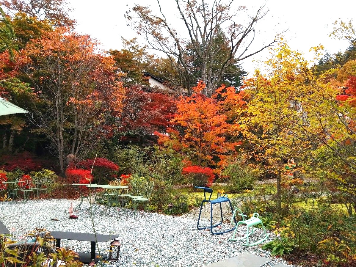 そして中庭に出ると、とにかくびっくりする。この中庭が素晴らしいのだ。アルプス館、愛宕館、碓氷館の伝統建築に囲まれた中庭は、紅葉の軽井沢を凝縮したような素晴らしい景色だった。これはきれいだ。