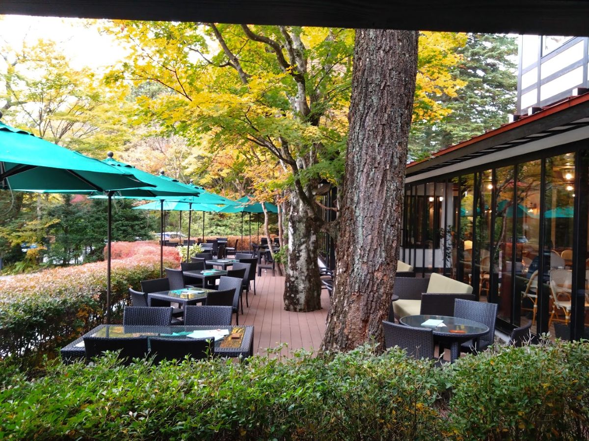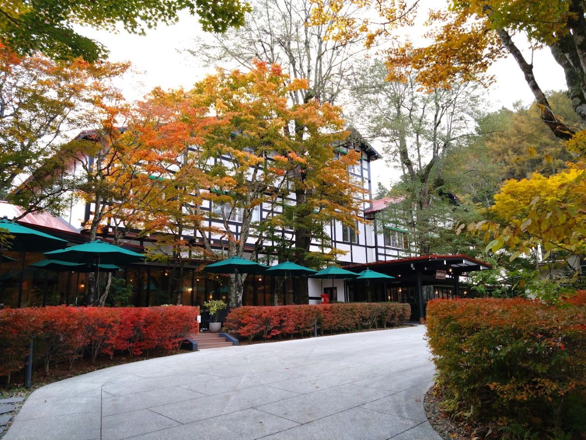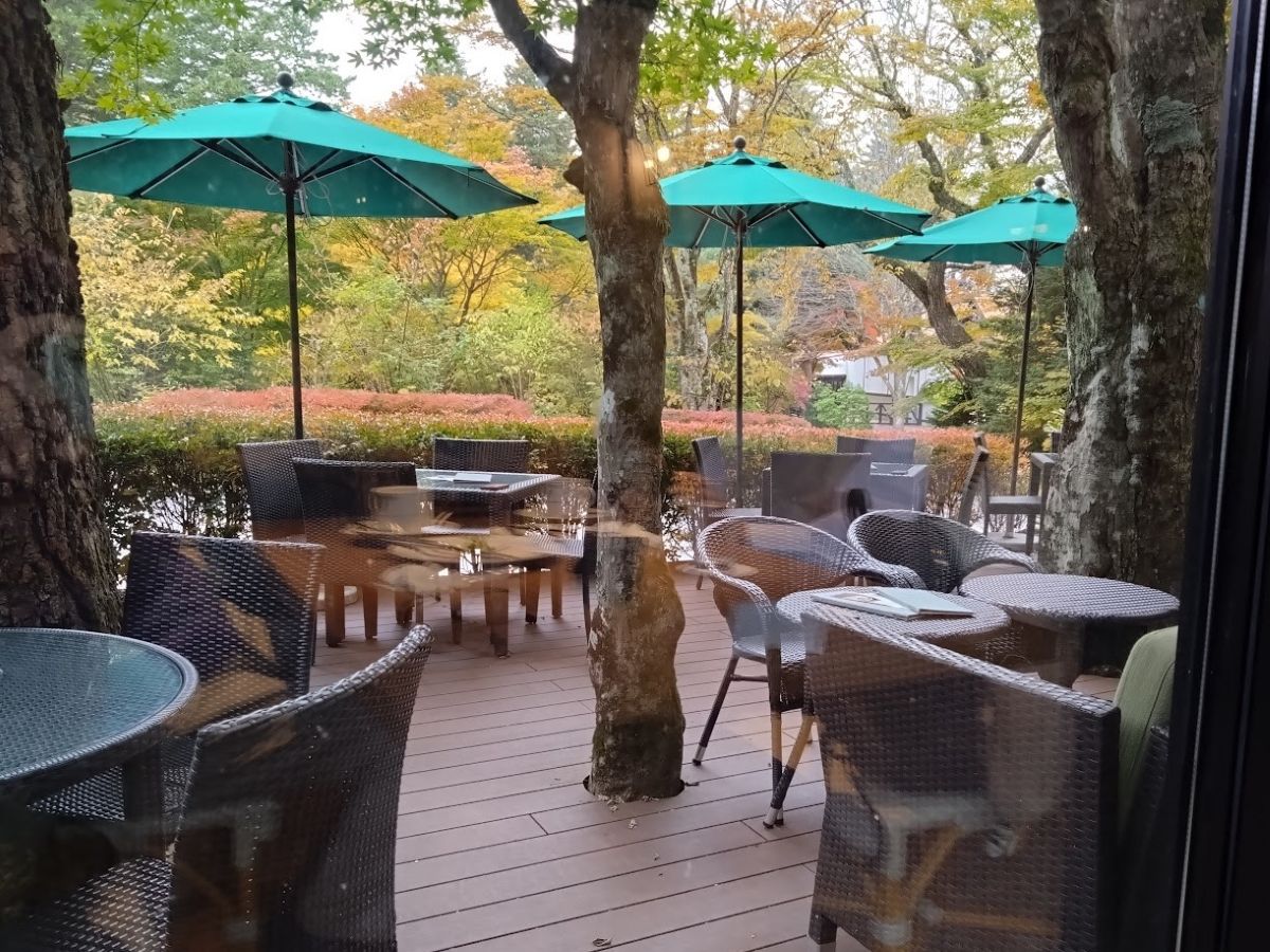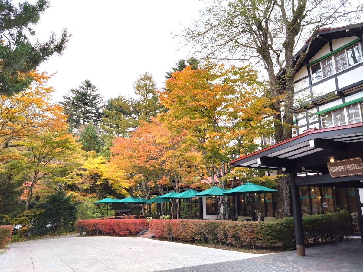 ロータリーの緩やかな斜面を登っていくと、手前の屋外にカフェテラス、そして色付いた木々に囲まれた万平ホテルの顔「アルプス館」が出てくる。ここは撮影のベストスポットかな、たぶんニュース映像でしばしば見たのだろう、一番代表的なあの光景だった。
