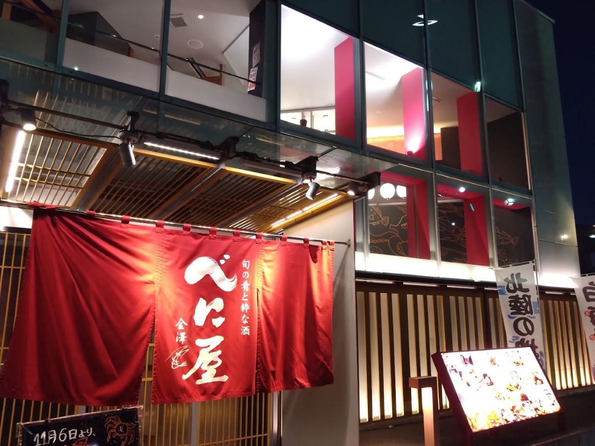 幹事が六枚町交差点にある会場「べに屋」に着いたのは、オープンを知らせる大きな暖簾が店頭に出たばかりの時刻でした。中に入ると、そこは大きな吹き抜けで、その階段を上がると店内です。笑顔で迎えてくれた若い女性スタッフに誘導されて奥の座敷に向かいます。