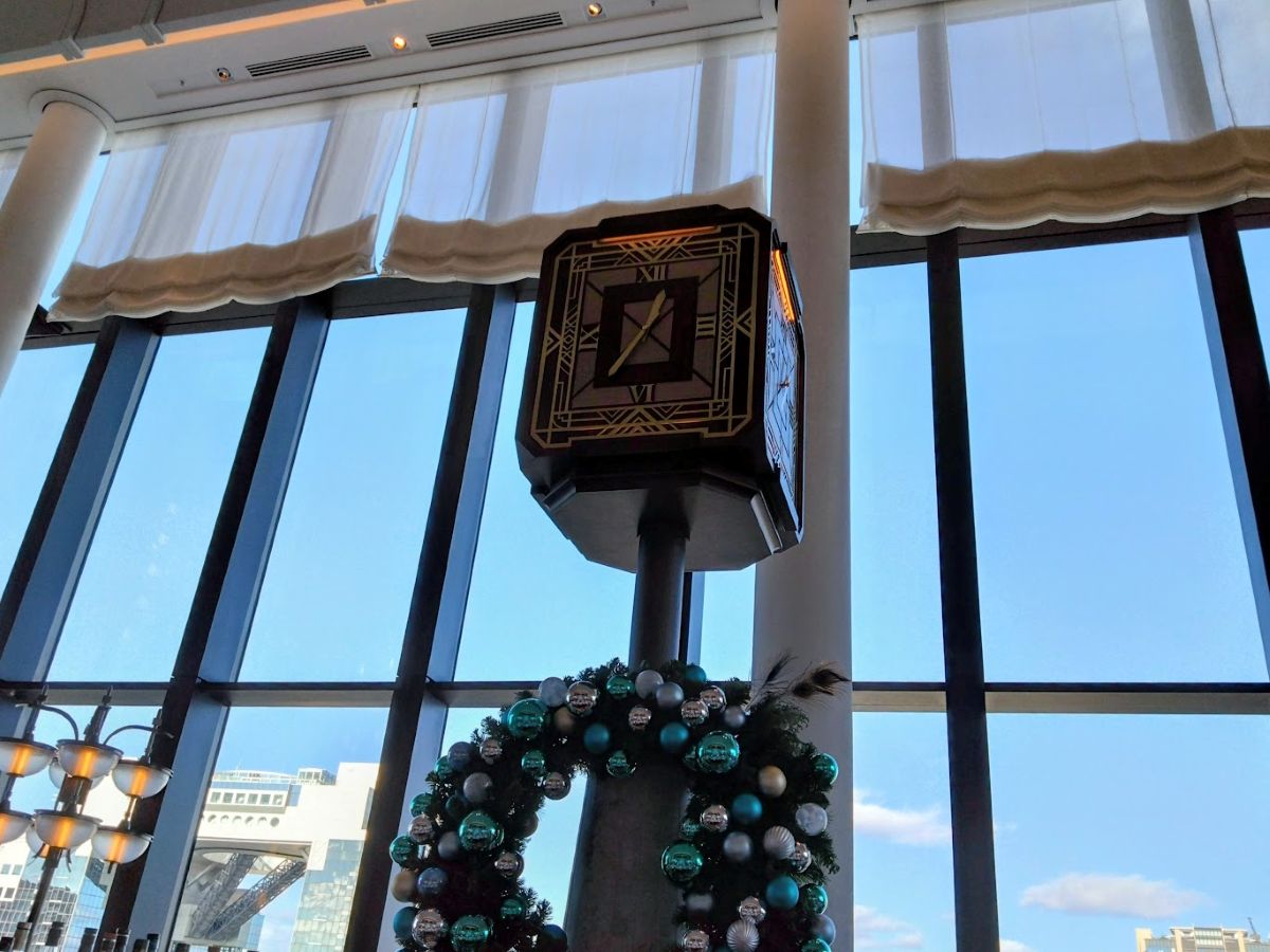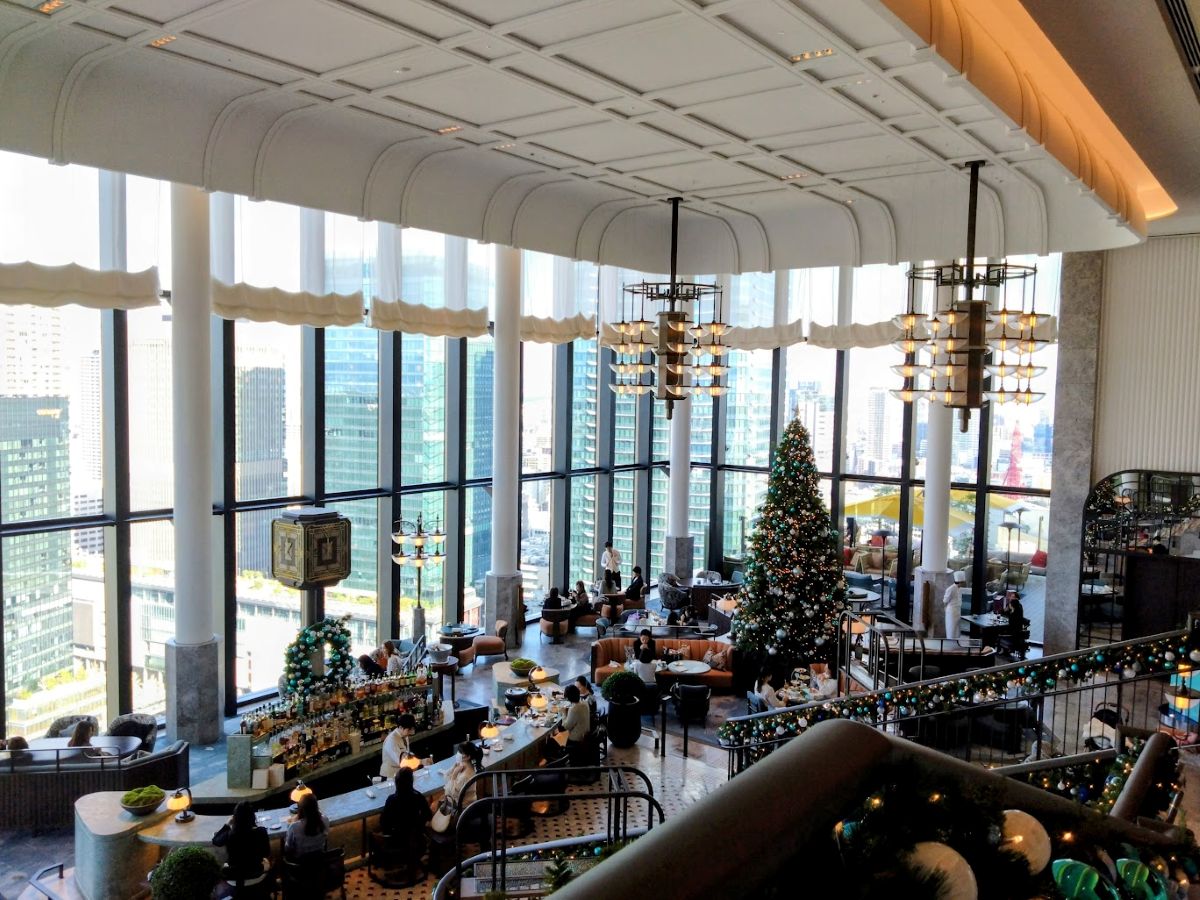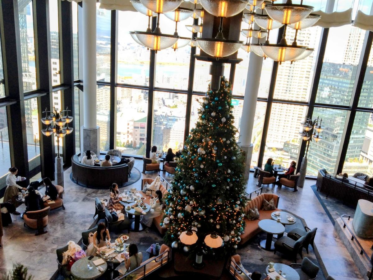 窓際のテーブルは女性たちが占拠している。アフタヌーンティーを楽しみながら盛んにスマホで撮影会という感じだ。脇のソファー席ではシニアの方々のランチタイムかな。左右の空間に配置された巨大なクリスマスツリーがいい感じだ。さらに奥には外部テラスもある(28階の空中テラス)。まぁ贅沢な空間ということだ。