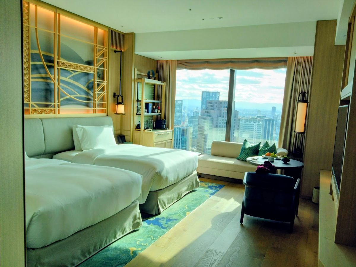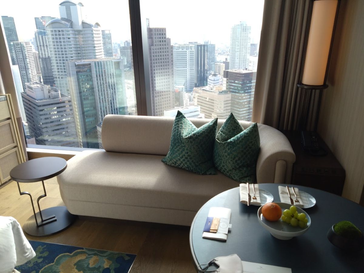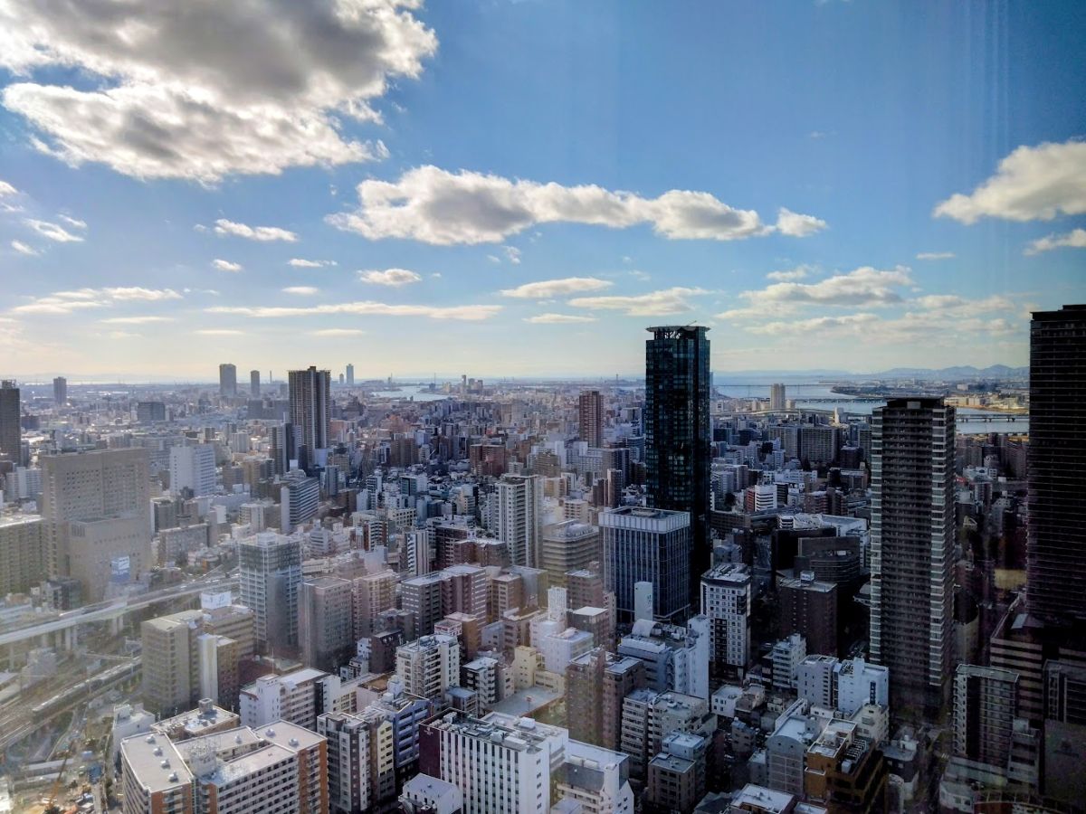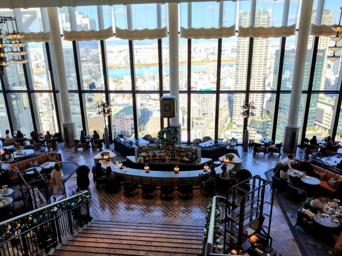 大きなガラス越しの眼下に大阪の街並みが広がる。本気のパノラマビューってやつだ。スゲ~としか言いようがない迫力だった。ちなみにこの景色の写真は、このホテルを象徴する1枚として広告に使われている。今日は天気にも恵まれて素晴らしい表情を見せていた。