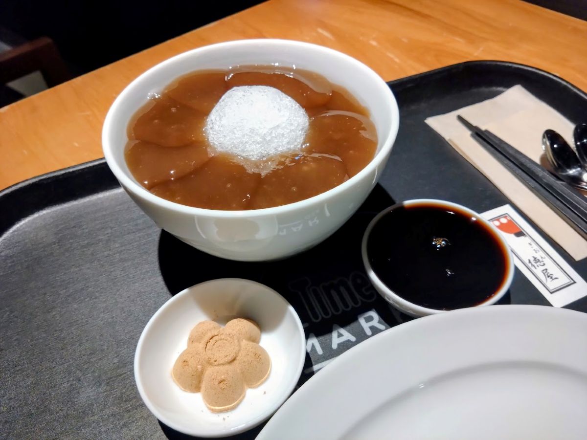 もうすぐホテルという道すがら、グラングリーン南館のフードホールに「ぎおん徳屋」があるのを見つけた。あの京都祇園・花見小路の「わらびもち」の名店だ。こんなところで出会えるとは驚きだ。もちろんデザートは別腹だから美味しく食べた。