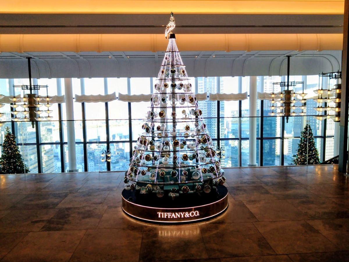 さて、朝の散歩に出かけよう。まずエレベータを降りて館内を歩く。もちろん誰もいない笑。エレベーターホールには、ティファニー製の(キラキラの)クリスマスツリーがある(ホテルとのコラボ企画らしい)。昨日はずっと人だかりの写真スポットだったのだが、こんな時間はポツンとあるだけで寂しそうだ。