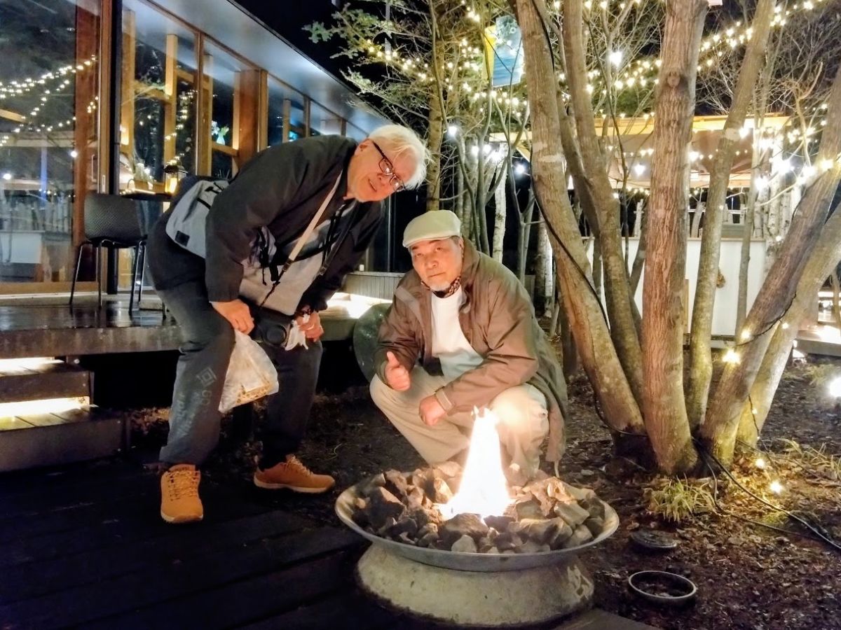 戻ったら、ホテルの建物が光に包まれて、とてもきれいだった。中央に焚き火のピットがあっていい感じなので、そこで仲間の写真を撮ることにした。ポーズはなかなかいいのだが、2人の顔には、もはや力がなく、笑みもなかった笑。おっさんは心底お疲れらしい。