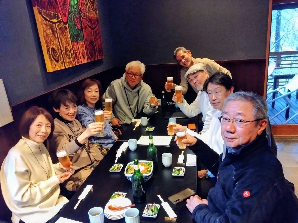 さて、風呂上がりの彼が合流し、再びハルニレテラスへ戻ると、会場の蕎麦屋の前の広場に、すでに同級生たちが集合していた。まだ予約時刻の前だけど、入れてもらおう。