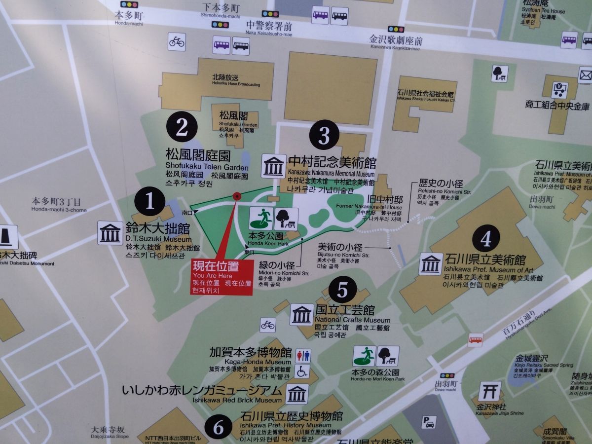 鈴木大拙館から、あの断崖の急階段(美術の小径)を登って県立美術館の裏手に出た。ここは美術館だらけのゾーンだ。そもそも本多の森公園というのは、広大な旧本多家の屋敷エリアの跡地だ。断崖の上、つまり小立野側には上屋敷(本家の屋敷)、崖の下が下屋敷(家来の屋敷)だったらしい。