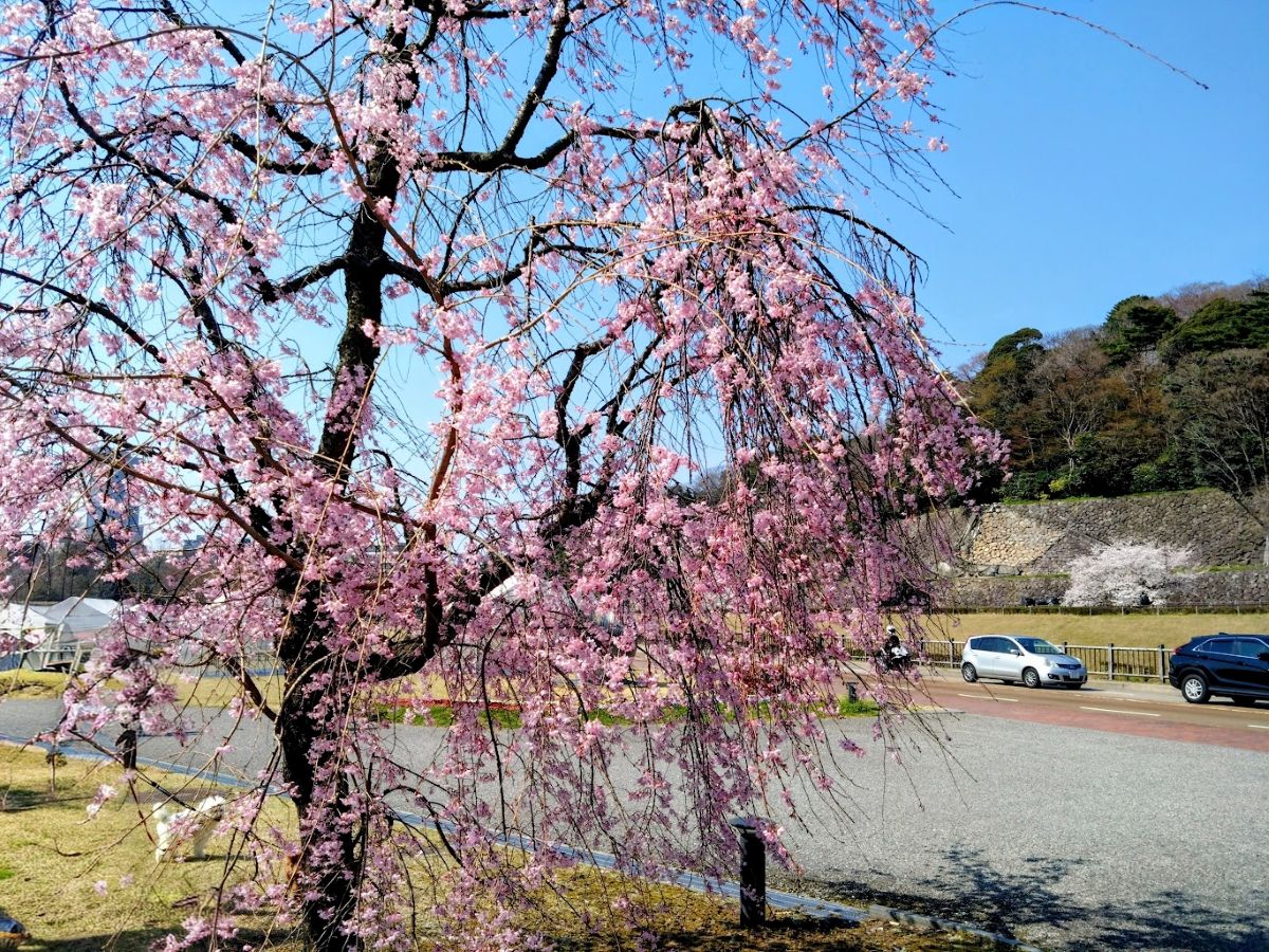 一の門、二の門の桝形を抜けると「三の丸広場」が広がる。あんまり桜の木は多くないのだが、正面の「五十間長屋」の右手に「菱櫓(ひしやぐら)」があって、そこに立派な桜並木が続いている。もちろん満開できれいだった。ここで何枚か写真に収めて、Uターンした。