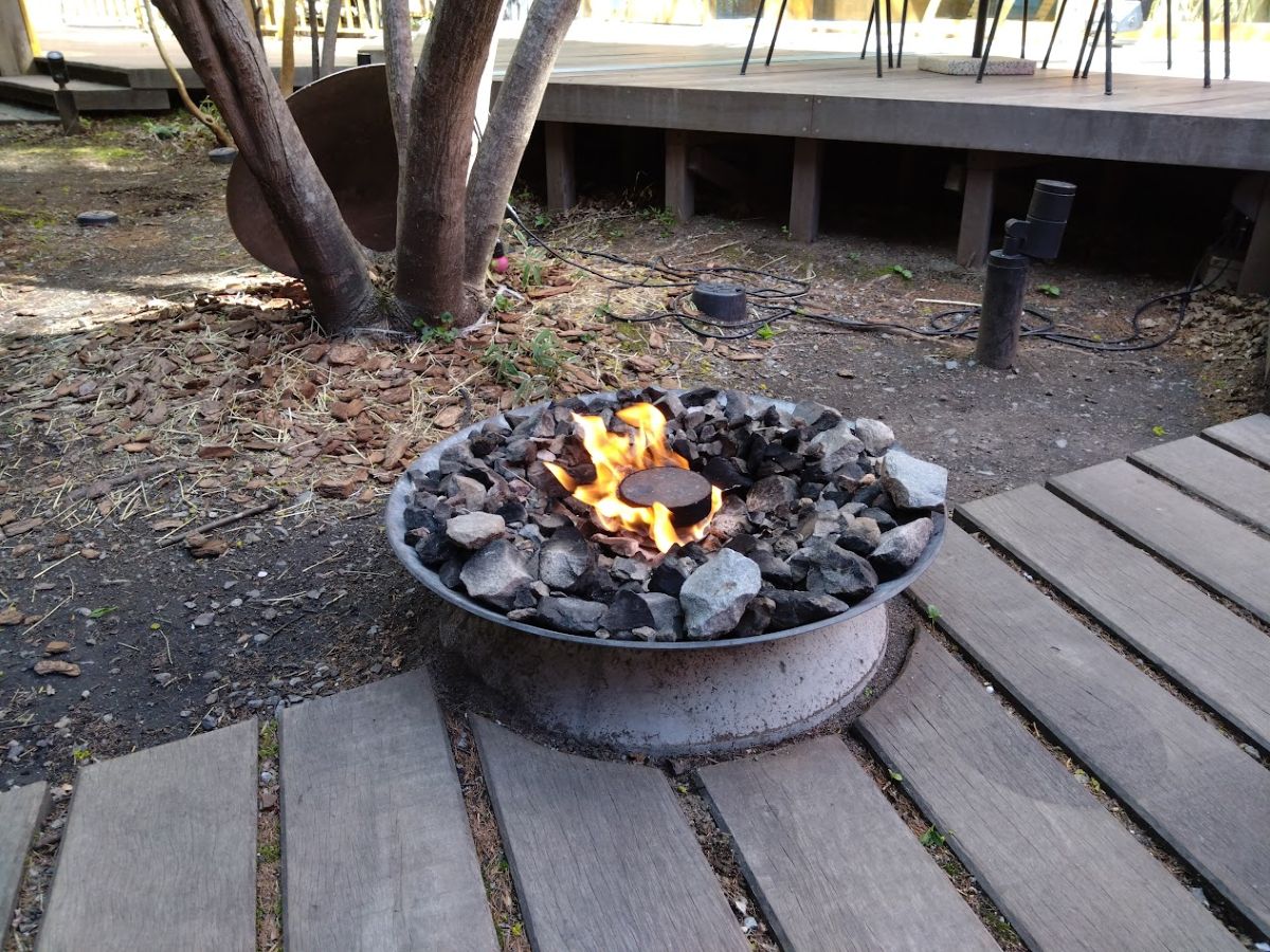 面白いのは、広い中庭だ。何層かのウッドデッキは自由に座れるようになっていて、やっぱりここにもシーズンごとのディスプレイが施されている。中央に焚き火のピットがあって、夜になると火が入る。庭は外に繋がっているので、ホテルに出入りする宿泊客は、誰もが中庭を通っていく。