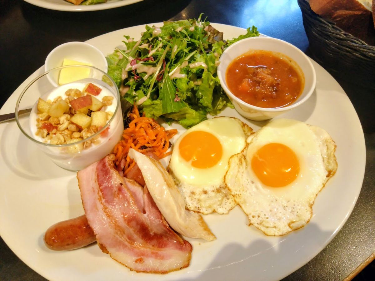 ここのパンは美味しい(パン屋だから当たり前かな)。厚めのトーストにはバターが添えてあるのだが、彼はオリーブオイルを試していた。とても旨いらしい。大きなベーコンやソーセージ、そして目玉焼きの卵が2個なので、なぜか贅沢な感じがする笑。