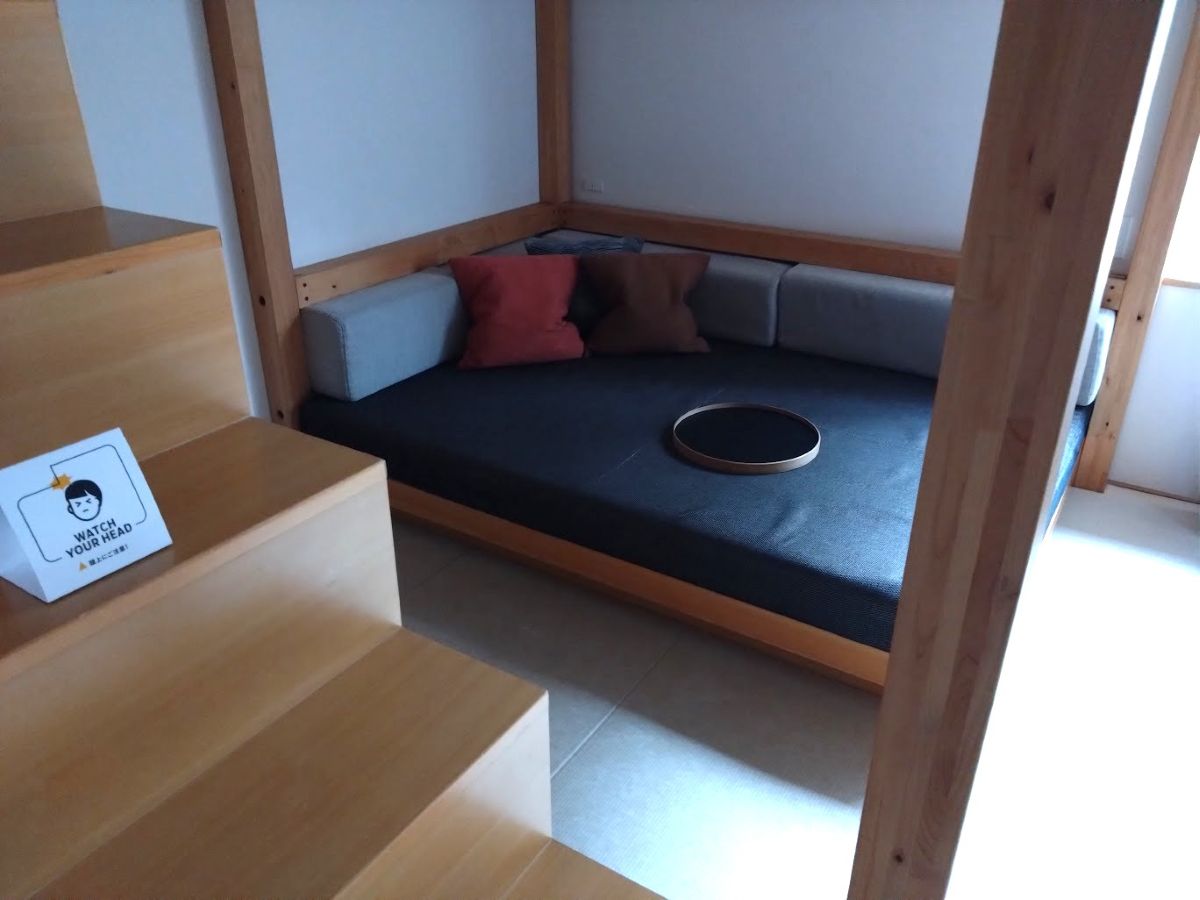 ホテルなのに部屋に入るときは靴を脱ぐ。部屋にはなぜか天井までつながる「四角いヤグラ」がある。それは2段構造になっていて、下は広いソファだ。ソファの横に階段があるので、それを登ると上はベッド×2になっている。