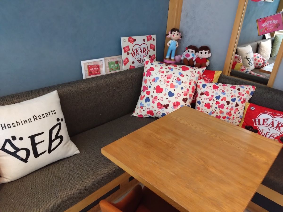 ロビーの奥がカフェのカウンター、そして左手にフロントデスクがある。その周辺がカフェラウンジだ。某チョコメーカーとのコラボ期間ってことらしく、ペコちゃん人形とか桜色のポップコーン(マシン)とか、何かとエモいディスプレイばかりだった。