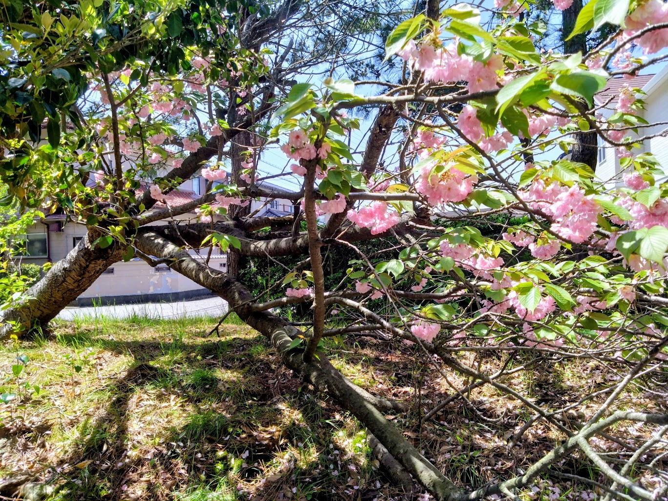 そんなある日のこと、散歩の途中で、倒れたばかりの八重桜を見つけた。どんな理由でそうなったのか分からないのだが、その倒れたさくらは、ちゃんと咲いたままだから、なんだかとても切なくなった。上手な言葉は見つからないが、長年ありがとうって気持ちかなぁ。