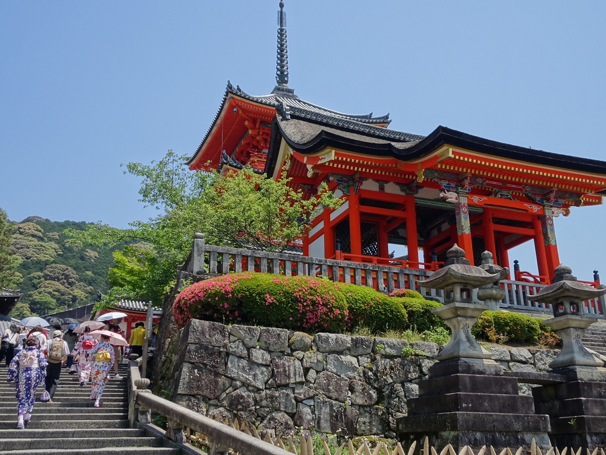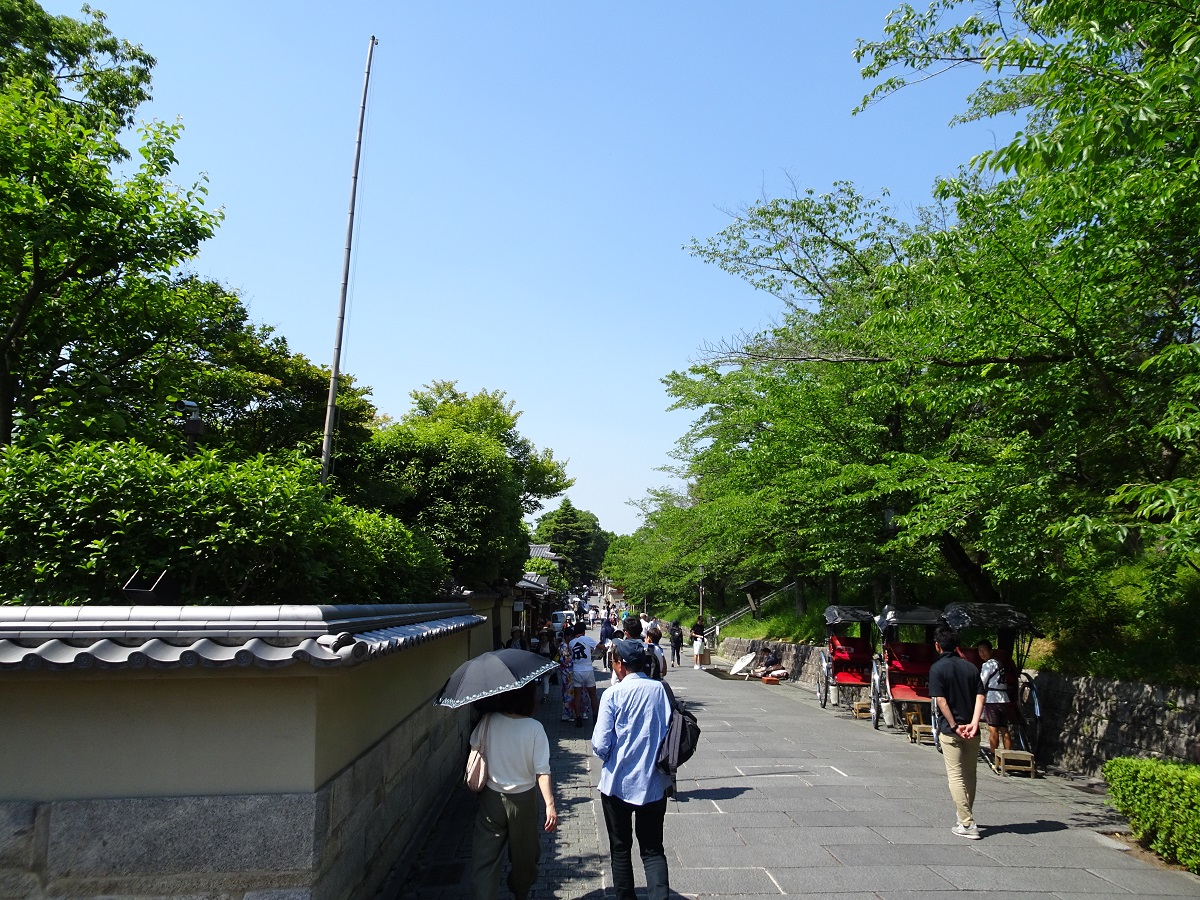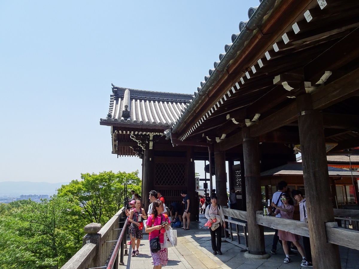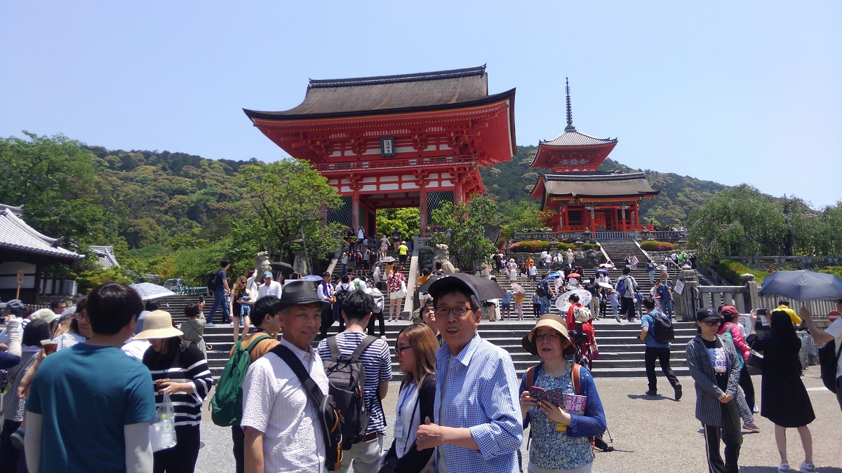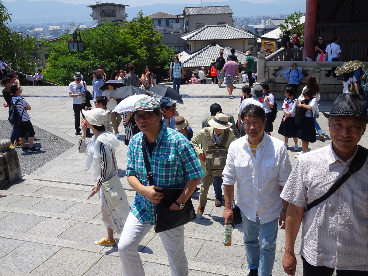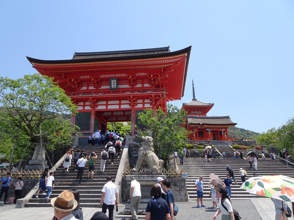 集合場所は清水寺正面の仁王門だった。雲ひとつない京都の空に、朱色の仁王門がきりりと立ち上がっているように見えた。何回も観た景色だと思うのだが、威風堂々で、今日はやたらとカッコいい。幹事は目立つ場所に立って、目印にならないと、後から来た人には、わからないかなぁ、とは思うのだが、なんせ暑くて、じっとしていられない。思ったより湿度はなくカラリとしているのだが、それでもやはり暑い。今日は予定変更して、とにかく無理せずゆっくり歩いて欲しいな。5月の清水寺は修学旅行のピークらしい。横の階段部分では、どこかの中学校くらいの生徒さんたちが整列写真を撮っている。僕たちにもあんなカワイイ時期があったんだよなぁ。